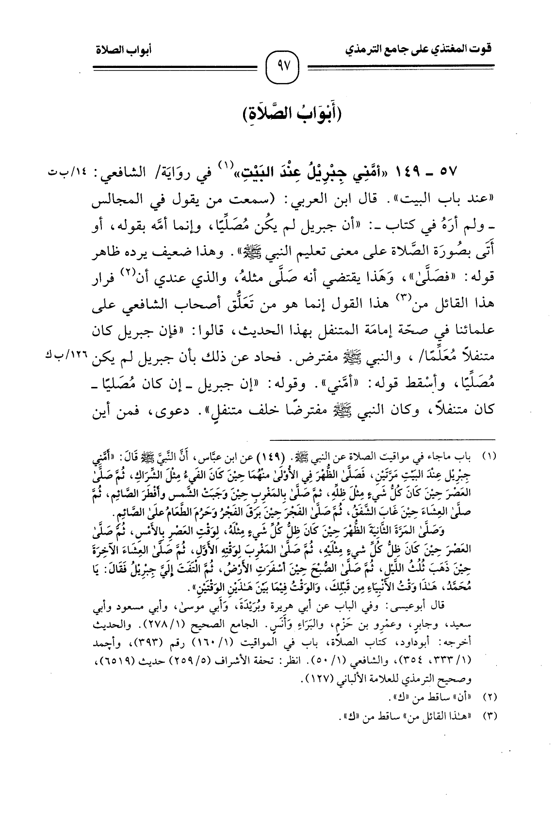 (¬1) باب ما جاء في مواقيت الصلاة عن النبي - صَلَّى اللَّهُ عَلَيْهِ وَسَلَّمَ -. (149) عن ابن عبَّاس، أَن النَّبي - صَلَّى اللَّهُ عَلَيْهِ وَسَلَّمَ - قَالَ: " أمَّنِي جِبْرِيْل عِنْدَ البيتِ مَرَتَيْنِ، فَصَلَّى الظُهْرَ فِي الأوْلى منْهُمَا حِيْنَ كانَ الفَيءُ مِثْلَ الشِّرَاكِ، ثُمَّ صّلَّى العَصْرَ حِيْنَ كانَ كُل شَيءٍ مِثْلَ ظِلِّهِ، ثمَّ صَلَّى بالمَغْرِبِ حِيْنَ وَجَبَتْ الشَمس وأفْطَرَ الصائِم، ثُمَّ صلَّى العِشَاءَ حِيْنَ غَابَ الشَفَقُ، ثُمَّ صّلَّى الفَجْر حِيْنَ برَقَ الفَجْرُ وَحَرُمَ الطعَامُ علَى الصَّائِم.