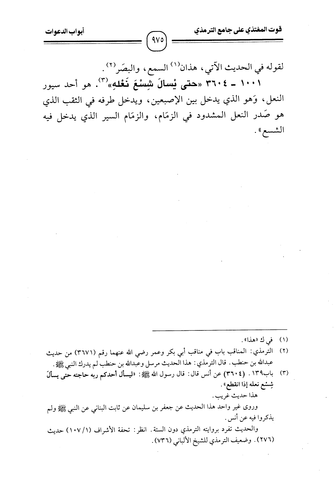 1001 -[3604] "حتى يْسألَ شِسْعَ نَعْلهِ". هو أحد سيور النعل، وَهو الذي يدخل بين الإصبعين، ويدخل طرفه في الثقب الذي هو صَدر النعل المشدود في الزمَام، والزمَام السير الذي يدخل فيه الشسع".