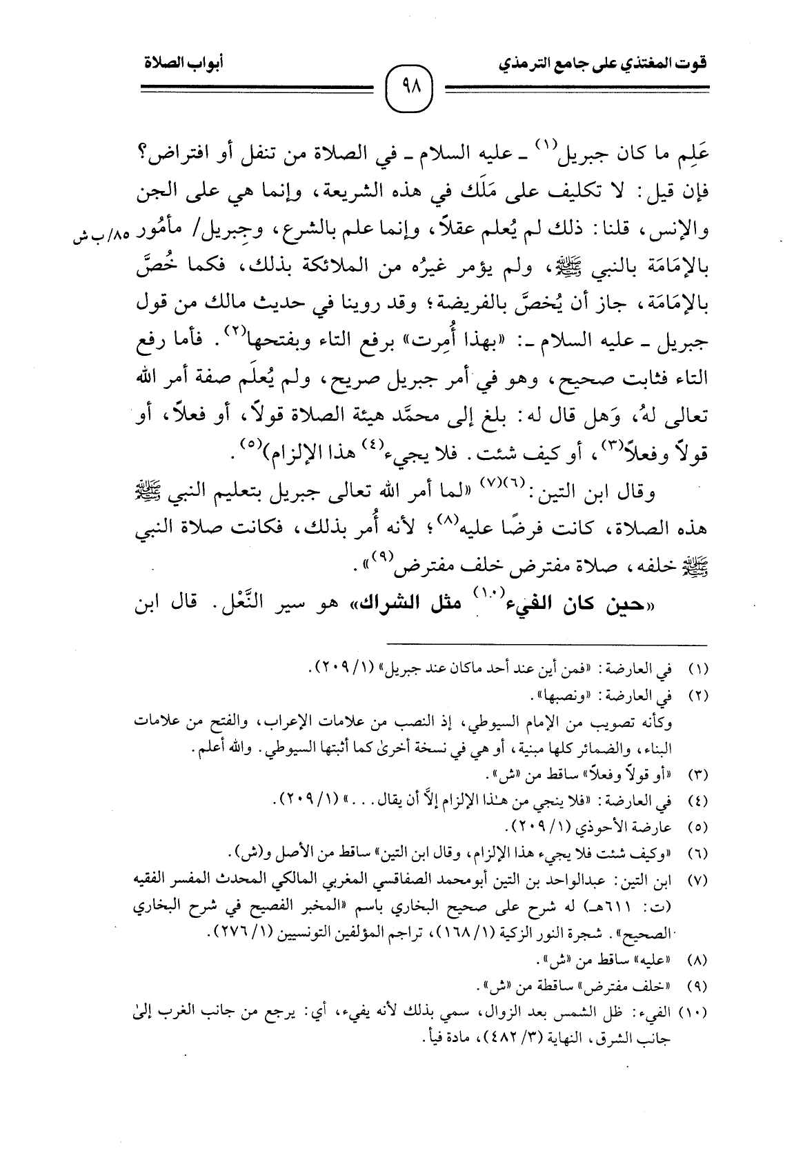 عَلِم ما كان جبريل (¬1) -عليه السلام- في الصلاة من تنفل أو افتراض؟ فإن قيل: لا تكليف على مَلَك في هذه الشريعة، وإنما هي على الجن والإنس، قلنا: ذلك لم يُعلم عقلاً، وإنما علم بالشرع، وجِبريل مأمُور بالإمَامَة بالنبي - صَلَّى اللَّهُ عَلَيْهِ وَسَلَّمَ -، ولم يؤمر غيرُه من الملائكة بذلك، فكما خُصَّ بالإمَامَة، جاز أن يُخصَّ بالفريضة؛ وقد روينا في حديث مالك من قول جبريل -عليه السلام-: " بهذا أُمِرت " برفع التاء وبفتحها (¬2) . فأما رفع التاء فثابت صحيح، وهو في أمر جبريل صريح، ولم يُعلَم صفة أمر الله تعالى لهُ، وَهل قال له: بلغ إلى محمَّد هيئة الصلاة قولاً، أو فعلاً، أو قولاً وفعلاً (¬3) ، أو كيف شئت. فلا يجيء (¬4) هذا الإلزام) (¬5) .