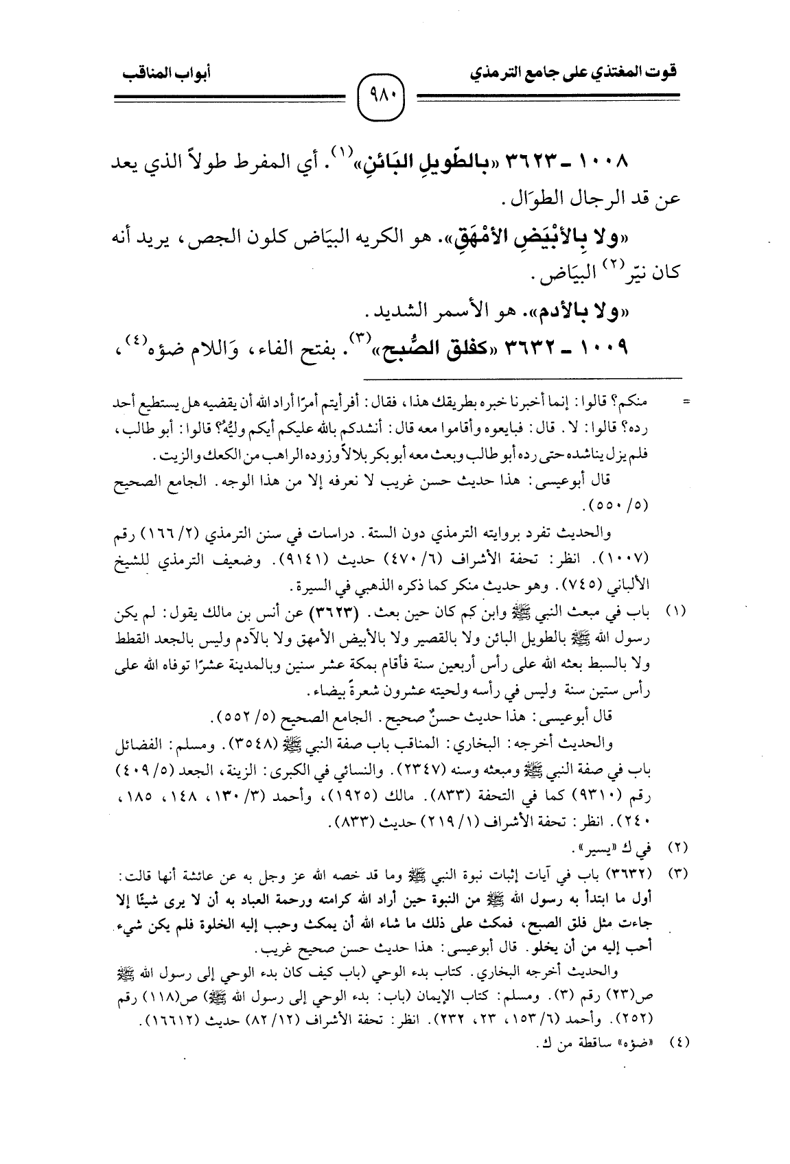 1008 -[3623] "بالطّويلِ البَائنِ". أي المفرط طولاً الذي يعد عن قد الرجال الطوَال.