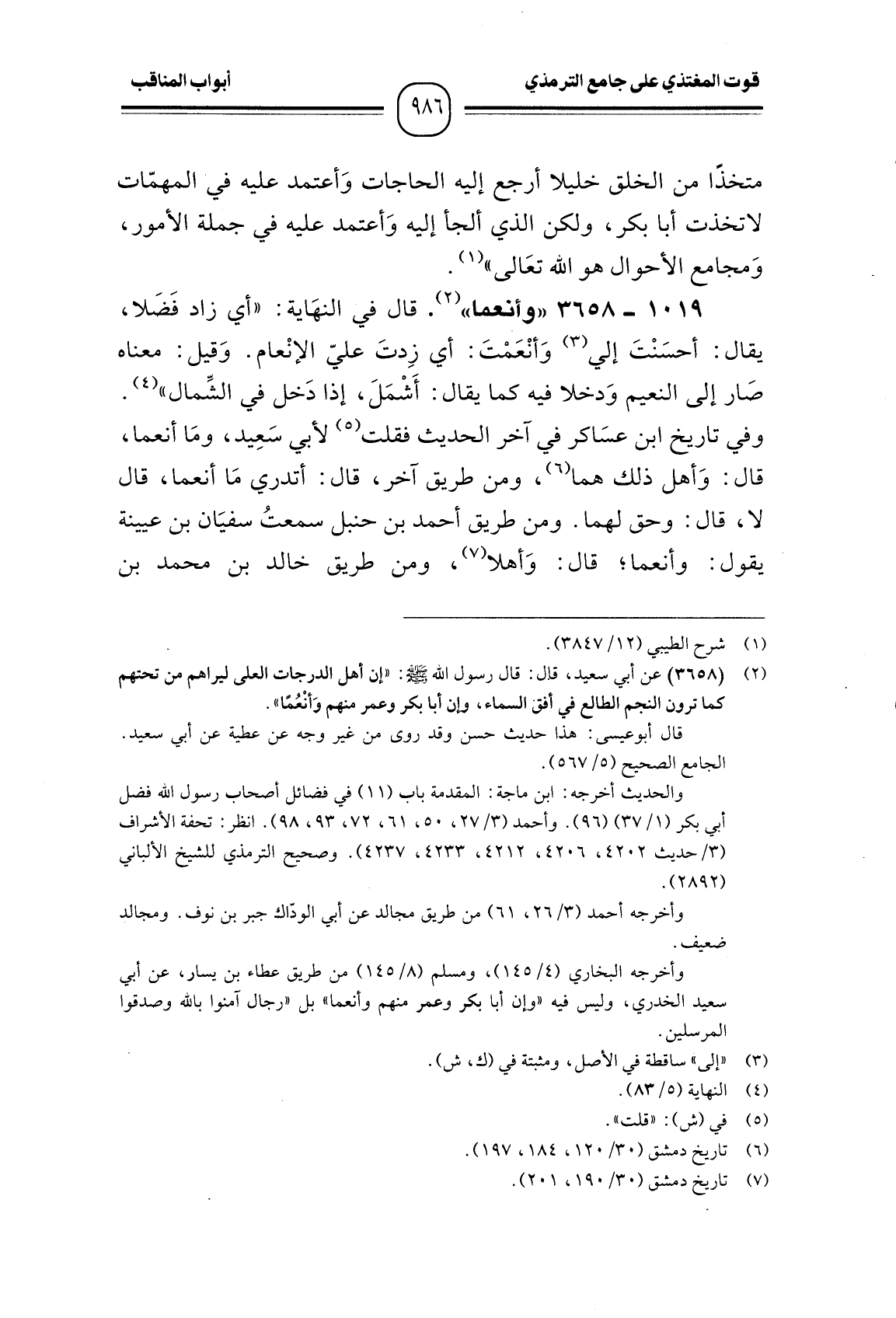 1019 -[3658] "وأنعما". قال في النهَاية: " أي زاد فَضَلا، يقال: أحسَنْتَ إلي وَأنْعَمْتَ: أي زِدتَ عليّ الإنْعام. وَقيل: معناه صَار إلى النعيم وَدخلا فيه كما يقال: أَشْمَلَ، إذا دَخل في الشِّمال ".