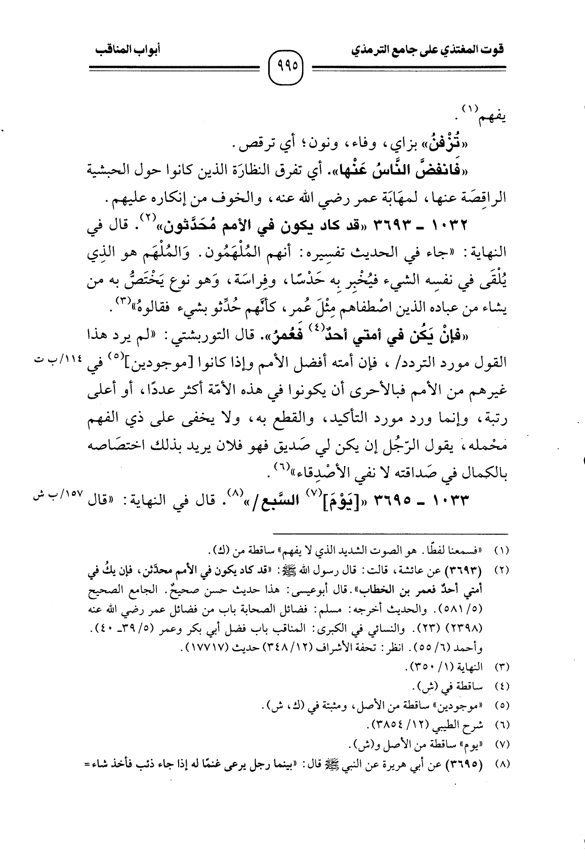 1032 -[3693] "قد كاد يكون في الأمم مُحَدَّثون". قال في النهاية: " جاء في الحديث تفسِيره: أنهم المُلْهَمُون. وَالمُلْهَم هو الذِي يُلْقَى في نفسِه الشيء فيُخْبِر بِه حَدْسًا، وفِراسَة، وَهو نوع يَخْتَصُّ به من يشاء من عباده الذين اصطفاهم مِثْلَ عُمِر، كأنَّهم حُدِّثو بشيء فقالوهُ ".