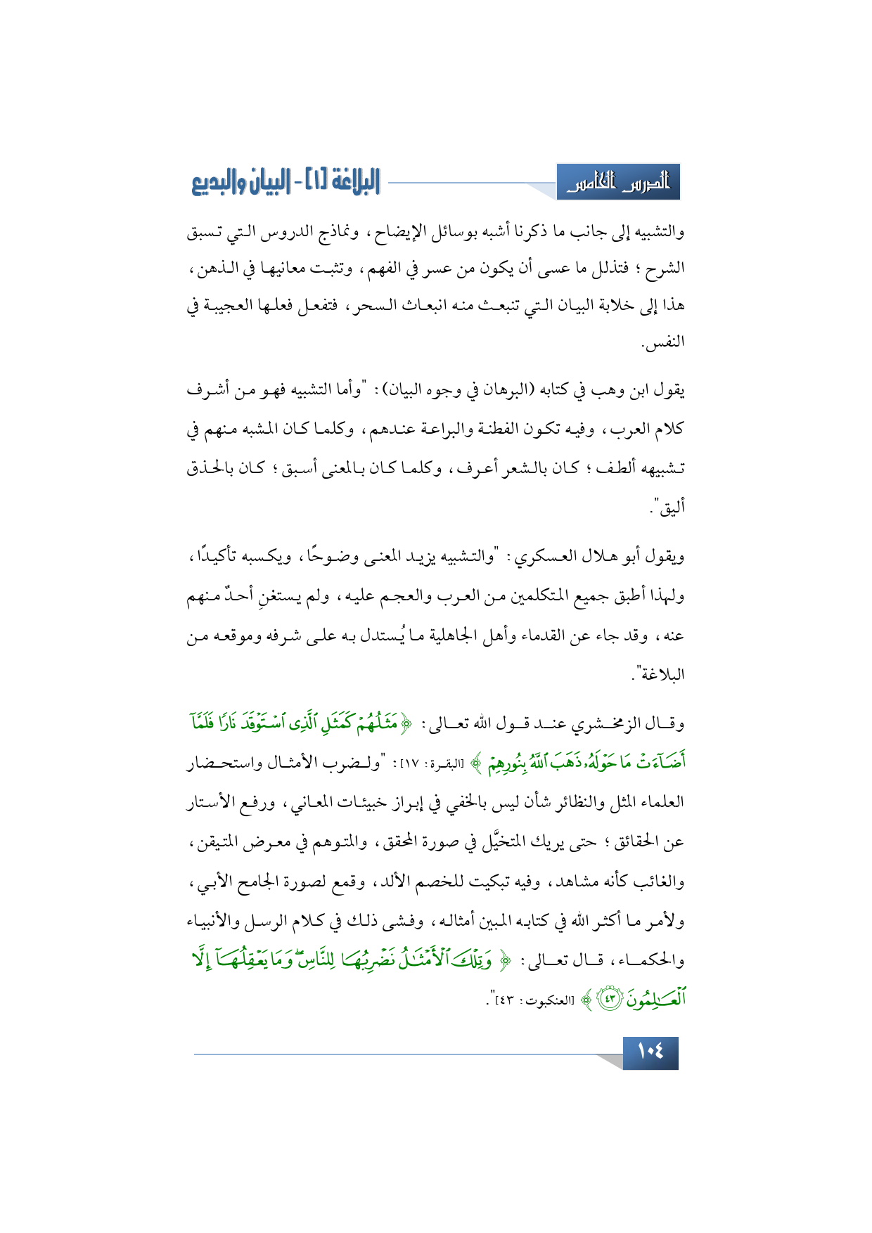 والتشبيه إلى جانب ما ذكرنا أشبه بوسائل الإيضاح، ونماذج الدروس التي تسبق الشرح؛ فتذلل ما عسى أن يكون من عسر في الفهم، وتثبت معانيها في الذهن، هذا إلى خلابة البيان التي تنبعث منه انبعاث السحر، فتفعل فعلها العجيبة في النفس.