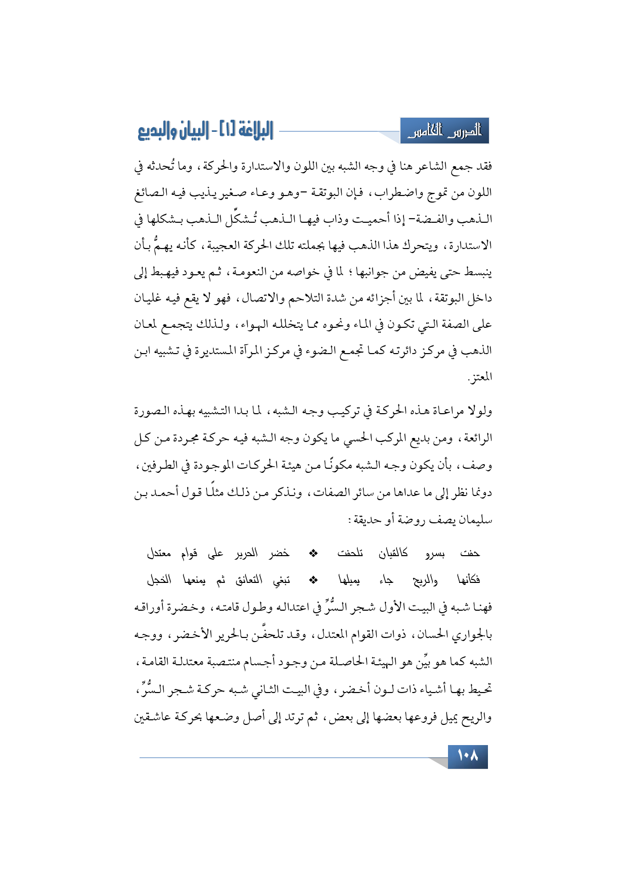 ولولا مراعاة هذه الحركة في تركيب وجه الشبه، لما بدا التشبيه بهذه الصورة الرائعة، ومن بديع المركب الحسي ما يكون وجه الشبه فيه حركة مجردة من كل وصف، بأن يكون وجه الشبه مكونًا من هيئة الحركات الموجودة في الطرفين، دون ما نظر إلى ما عداها من سائر الصفات، ونذكر من ذلك مثلًا قول أحمد بن سليمان يصف روضة أو حديقة: