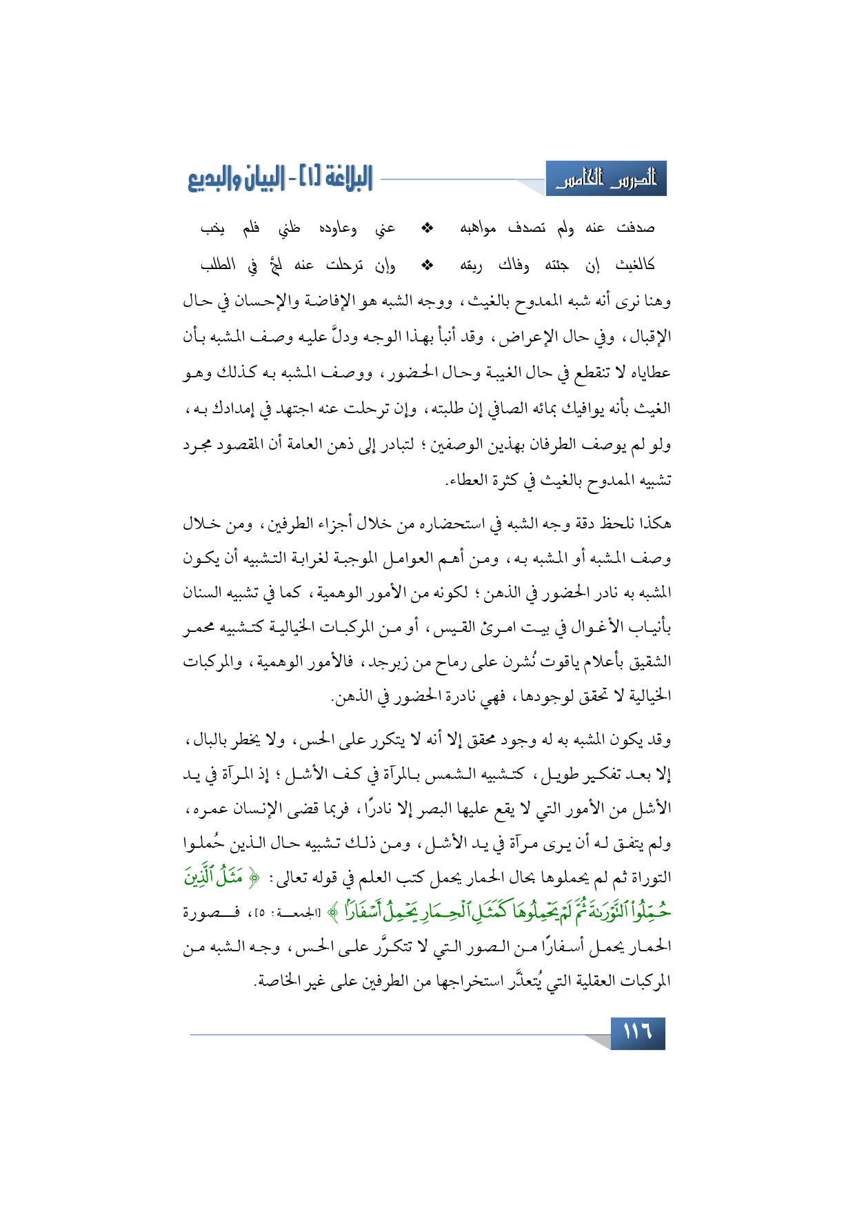 وهنا نرى أنه شبه الممدوح بالغيث، ووجه الشبه هو الإفاضة والإحسان في حال الإقبال، وفي حال الإعراض، وقد أنبأ بهذا الوجه ودلَّ عليه وصف المشبه بأن عطاياه لا تنقطع في حال الغيبة وحال الحضور، ووصف المشبه به كذلك وهو الغيث بأنه يوافيك بمائه الصافي إن طلبته، وإن ترحلت عنه اجتهد في إمدادك به، ولو لم يوصف الطرفان بهذين الوصفين؛ لتبادر إلى ذهن العامة أن المقصود مجرد تشبيه الممدوح بالغيث في كثرة العطاء.
