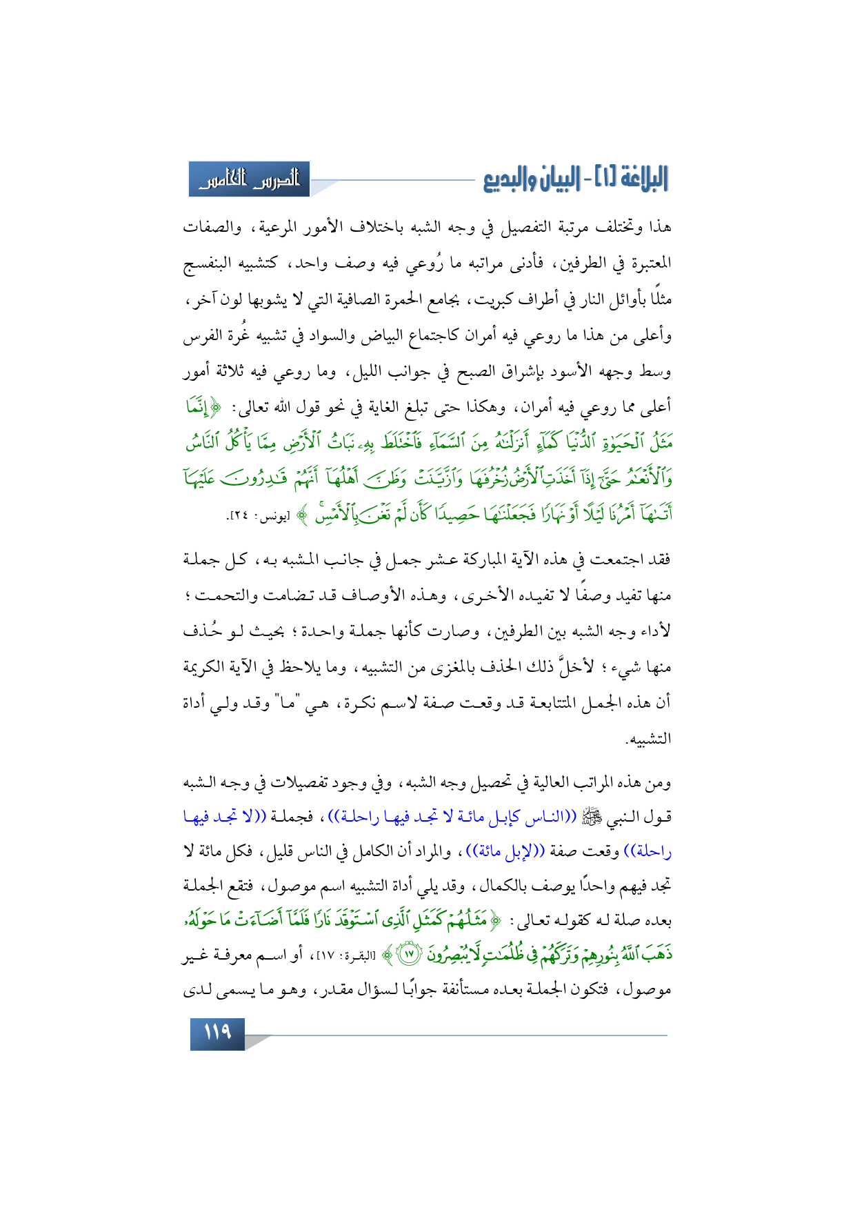 ومن هذه المراتب العالية في تحصيل وجه الشبه، وفي وجود تفصيلات في وجه الشبه قول النبي -صلى الله عليه وسلم- ((الناس كإبل مائة لا تجد فيها راحلة))، فجملة ((لا تجد فيها راحلة)) وقعت صفة ((لإبل مائة))، والمراد أن الكامل في الناس قليل، فكل مائة لا تجد فيهم واحدًا يوصف بالكمال، وقد يلي أداة التشبيه اسم موصول، فتقع الجملة بعده صلة له كقوله تعالى: {مَثَلُهُمْ كَمَثَلِ الَّذِي اسْتَوْقَدَ نَارًا فَلَمَّا أَضَاءَتْ مَا حَوْلَهُ ذَهَبَ اللَّهُ بِنُورِهِمْ وَتَرَكَهُمْ فِي ظُلُمَاتٍ لَا يُبْصِرُونَ} (البقرة: 17)، أو اسم معرفة غير موصول، فتكون الجملة بعده مستأنفة جوابًا لسؤال مقدر، وهو ما يسمى لدى