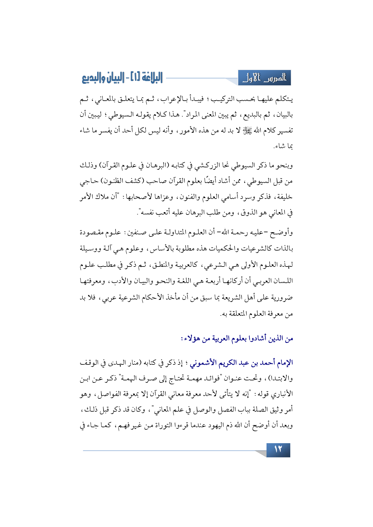 من هؤلاء أشادوا بعلوم العربية الإمام أحمد بن عبد الكريم الأشموني؛ إذ ذكر في كتابه (منار الهدى في الوقف والابتدا)، وتحت عنوان "فوائد مهمة تحتاج إلى صرف الهمة" ذكر عن ابن الأنباري قوله: "أنه لا يتأتى لأحد معرفة معاني القرآن إلا بمعرفة الفواصل، وهو أمر وثيق الصلة بباب الفصل والوصل في علم المعاني"، وكان قد ذكر قبل ذلك، وبعد أن أوضح أن الله ذم اليهود عندما قرءوا التوراة من غير فهم، كما جاء في