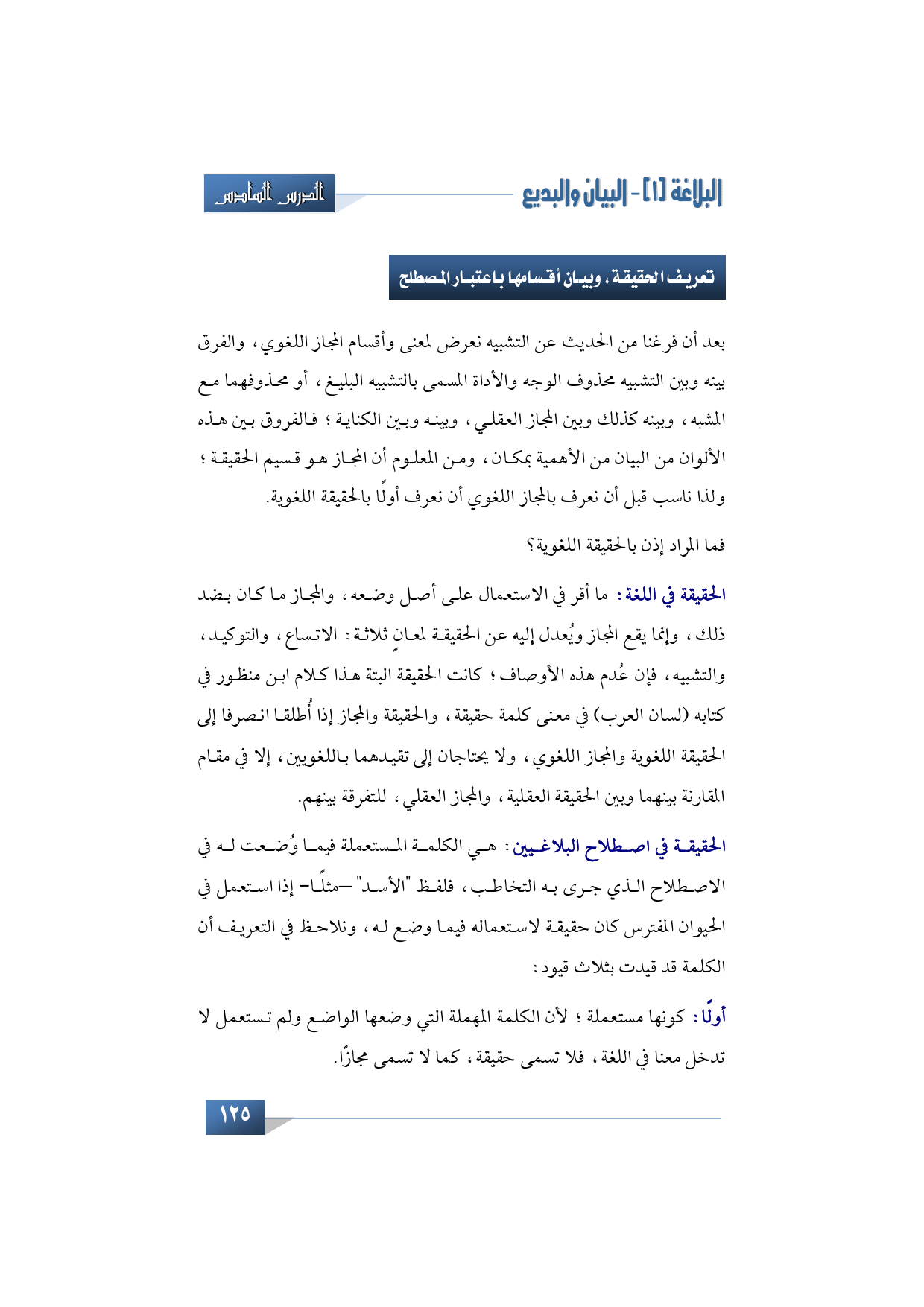 تعريف الحقيقة، وبيان أقسامها باعتبار المصطلح