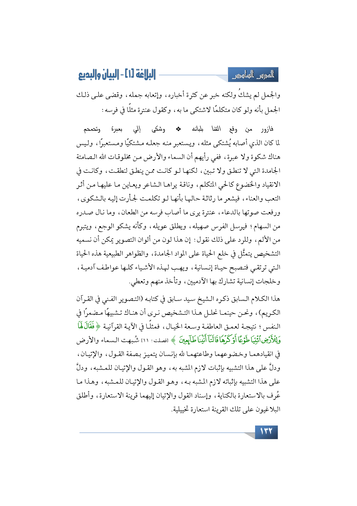 هذا الكلام السابق ذكره الشيخ سيد سابق في كتابه (التصوير الفني في القرآن الكريم)، ونحن حينما نحلل هذا التشخيص نرى أن هناك تشبيهًا مضمرًا في النفس؛ نتيجة لعمق العاطفة وسعة الخيال، فمثلًا في الآية القرآنية {فَقَالَ لَهَا وَلِلْأَرْضِ اِئْتِيَا طَوْعًا أَوْ كَرْهًا قَالَتَا أَتَيْنَا طَائِعِينَ} (فصلت: 11) شُبهت السماء والأرض في انقيادهما وخضوعهما وطاعتهما لله بإنسان يتميز بصفة القول، والإتيان، ودلَّ على هذا التشبيه بإثبات لازم المشبه به، وهو القول والإتيان للمشبه، ودلَّ على هذا التشبيه بإثباته لازم المشبه به، وهو القول والإتيان للمشبه، وهذا ما عُرف بالاستعارة بالكناية، وإسناد القول والإتيان إليهما قرينة الاستعارة، وأطلق البلاغيون على تلك القرينة استعارة تخييلية.