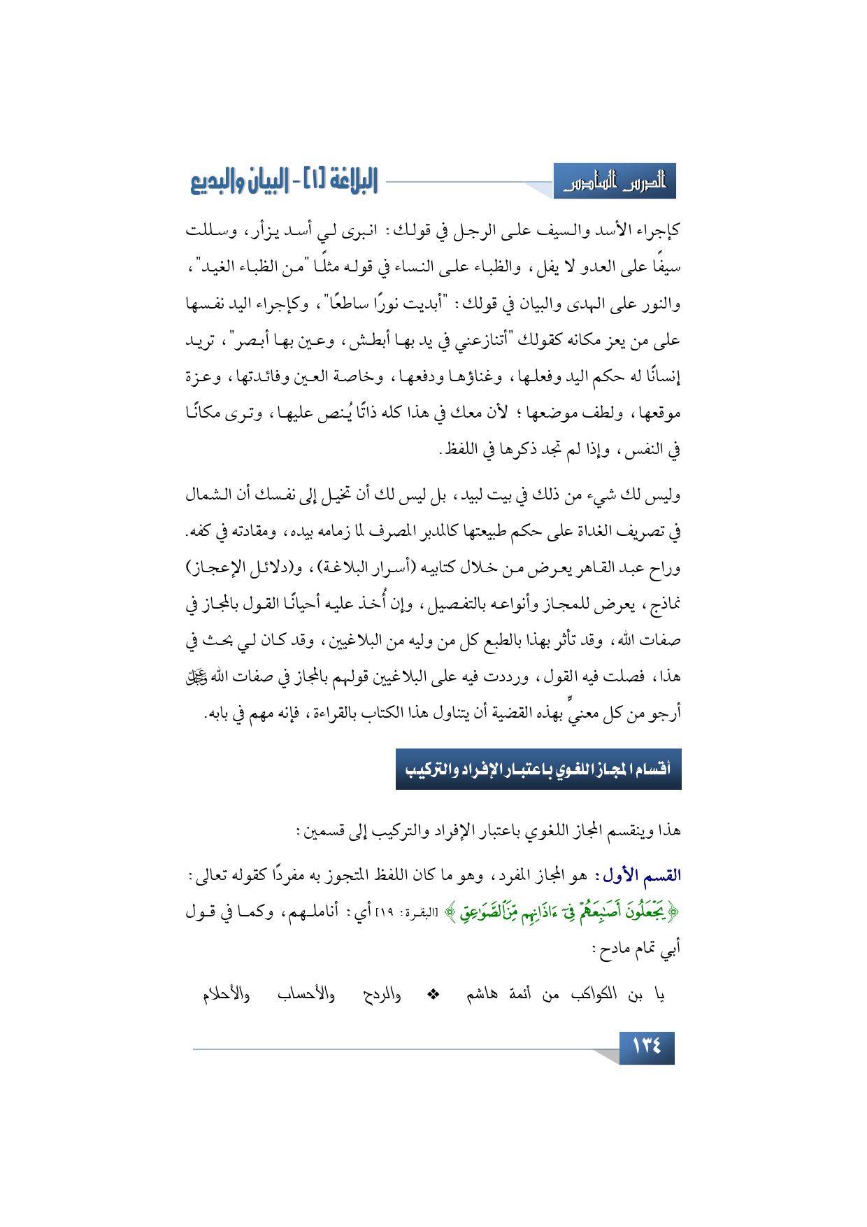 وراح عبد القاهر يعرض من خلال كتابيه (أسرار البلاغة)، و (دلائل الإعجاز) نماذج، يعرض للمجاز وأنواعه بالتفصيل، وإن أُخذ عليه أحيانًا القول بالمجاز في صفات الله، وقد تأثر بهذا بالطبع كل من وليه من البلاغيين، وقد كان لي بحث في هذا، فصلت فيه القول، ورددت فيه على البلاغيين قولهم بالمجاز في صفات الله -عز وجل- أرجو من كل معنيٍّ بهذه القضية أن يتناول هذا الكتاب بالقراءة، فإنه مهم في بابه.