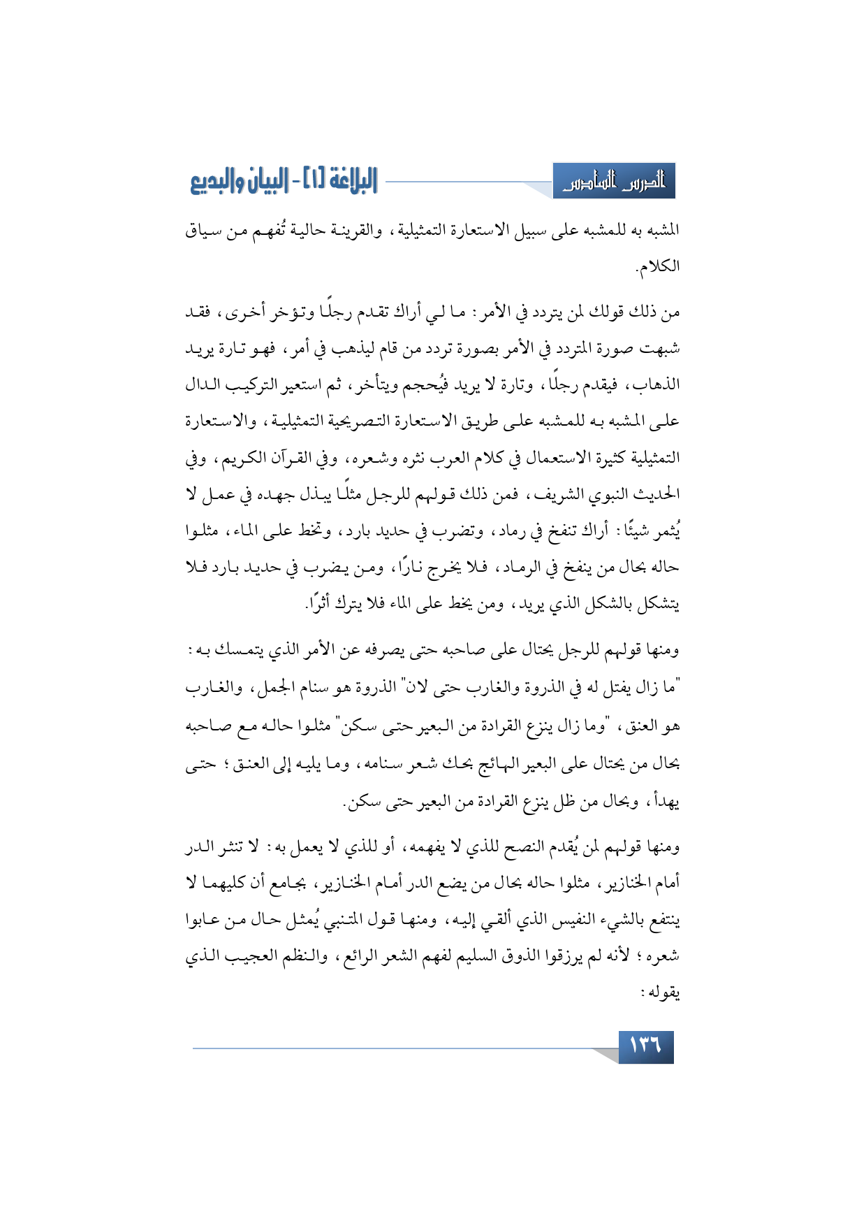 من ذلك قولك لمن يتردد في الأمر: ما لي أراك تقدم رجلًا وتؤخر أخرى، قد سبق أن ذكرناه، فقد شبهت صورة المتردد في الأمر بصورة تردد من قام ليذهب في أمر، فهو تارة يريد الذهاب، فيقدم رجلًا، وتارة لا يريد فيُحجم ويتأخر، ثم استعير التركيب الدال على المشبه به للمشبه على طريق الاستعارة التصريحية التمثيلية، والاستعارة التمثيلية كثيرة الاستعمال في كلام العرب نثره وشعره، وفي القرآن الكريم، وفي الحديث النبوي الشريف، فمن ذلك قولهم للرجل مثلًا يبذل جهده في عمل لا يُثمر شيئًا: أراك تنفخ في رماد، وتضرب في حديد بارد، وتخط على الماء، مثلوا حاله بحال من ينفخ في الرماد، فلا يخرج نارًا، ومن يضرب في حديد بارد فلا يتشكل بالشكل الذي يريد، ومن يخط على الماء فلا يترك أثرًا.