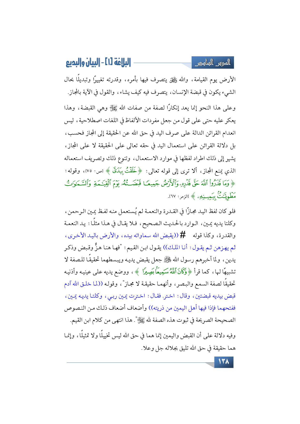 فلو كان لفظ اليد مجازًا في القدرة والنعمة لم يُستعمل منه لفظ يمين الرحمن، وكلتا يديه يمين، الوارد بالحديث الصحيح، فلا يقال في هذا مثلًا: يد النعمة والقدرة، وكذا قوله -عليه السلام- ((يقبض الله سماواته بيده، والأرض باليد الأخرى، ثم يهزهن ثم يقول: أنا الملك)) يقول ابن القيم: "فها هنا هزٌّ وقبض وذكر يدين، ولما أخبرهم رسول الله -صلى الله عليه وسلم- جعل يقبض يديه ويبسطهما تحقيقًا للصفة لا تشبيهًا لها، كما قرأ {وَكَانَ اللهُ سَمِيعًا بَصِيرًا}، ووضع يديه على عينيه وأذنيه تحقيقًا لصفة السمع والبصر، وأنهما حقيقة لا مجاز"، وقوله ((لما خلق الله آدم قبض بيديه قبضتين، وقال: اختر. فقال: اخترت يمين ربي، وكلتا يديه يمين، ففتحهما فإذا فيها أهل اليمين من ذريته)) وأضعاف أضعاف ذلك من النصوص الصحيحة الصريحة في ثبوت هذه الصفة لله -سبحانه وتعالى" هذا انتهى من كلام ابن القيم.