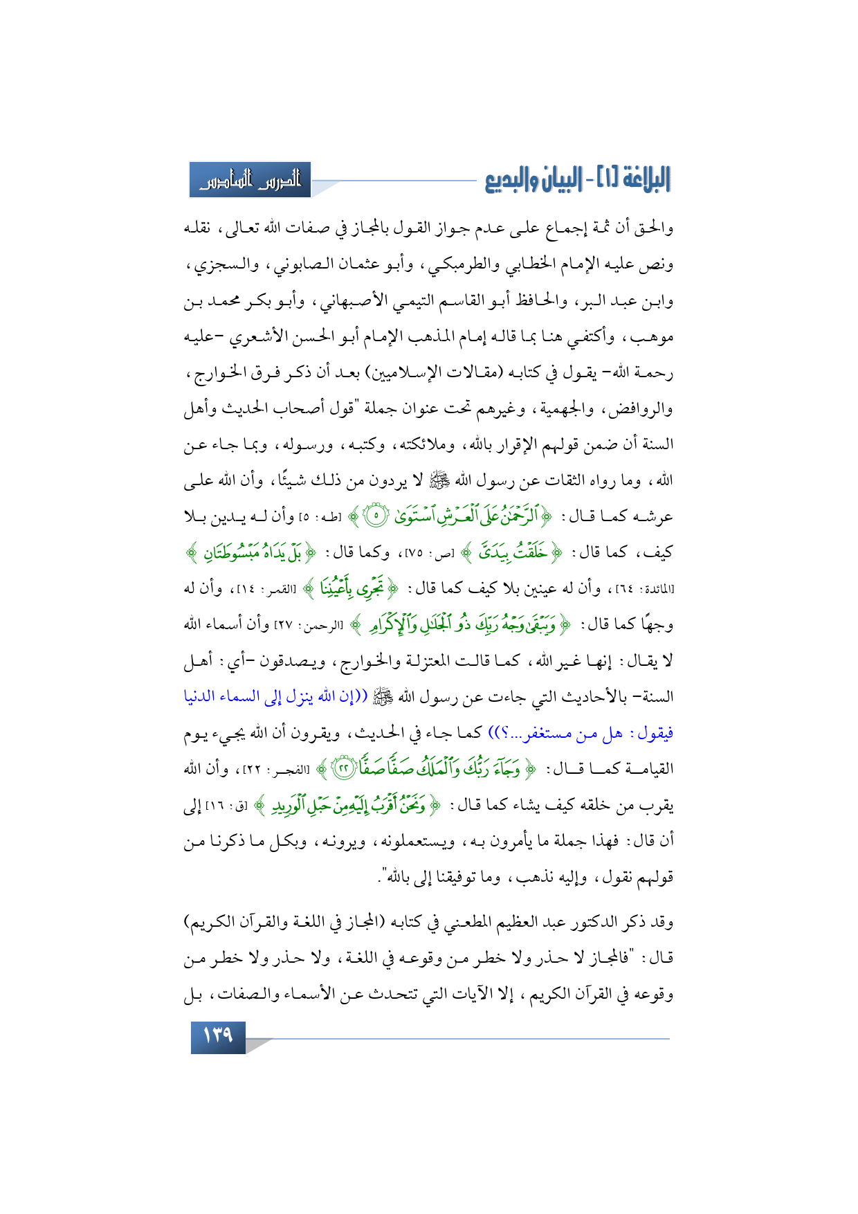 والحق أن ثمة إجماع على عدم جواز القول بالمجاز في صفات الله تعالى، نقله ونص عليه الإمام الخطابي والطرمبكي، وأبو عثمان الصابوني، والسجزي، وابن عبد البر، والحافظ أبو القاسم التيمي الأصبهاني، وأبو بكر محمد بن موهب، وأكتفي هنا بما قاله إمام المذهب ألإمام أبو الحسن الأشعري -عليه رحمة الله- يقول في كتابه (مقالات الإسلاميين) بعد أن ذكر فرق الخوارج، والروافض، والجهمية، وغيرهم تحت عنوان جملة "قول أصحاب الحديث وأهل السنة أن ضمن قولهم الإقرار بالله، وملائكته، وكتبه، ورسوله، وبما جاء عن الله، وما رواه الثقات عن رسول الله -صلى الله عليه وسلم- لا يردون من ذلك شيئًا، وأن الله على عرشه كما قال: {الرَّحْمَنُ عَلَى الْعَرْشِ اسْتَوَى} (طه: 5) وأن له يدين بلا كيف، كما قال: {خَلَقْتُ بِيَدَيَّ} (ص: 75)، وكما قال: {بَلْ يَدَاهُ مَبْسُوطَتَانِ} (المائدة: 64)، وأن له عينين بلا كيف كما قال: {تَجْرِي بِأَعْيُنِنَا} (القمر: 14)، وأن له وجهًا كما قال: {وَيَبْقَى وَجْهُ رَبِّكَ ذُو الْجَلَالِ وَالْإِكْرَامِ} (الرحمن: 27) وأن أسماء الله لا يقال: إنها غير الله، كما قالت المعتزلة والخوارج، ويصدقون -أي: أهل السنة- بالأحاديث التي جاءت عن رسول الله -صلى الله عليه وسلم- ((إن الله ينزل إلى السماء الدنيا فيقول: هل من مستغفر)) كما جاء في الحديث، ويقرون أن الله يجيء يوم القيامة كما قال: {وَجَاءَ رَبُّكَ وَالْمَلَكُ صَفًّا صَفًّا} (الفجر: 22)، وأن الله يقرب من خلقه كيف يشاء كما قال: {وَنَحْنُ أَقْرَبُ إِلَيْهِ مِنْ حَبْلِ الْوَرِيدِ} (ق: 16) إلى أن قال: فهذا جملة ما يأمرون به، ويستعملونه، ويرونه، وبكل ما ذكرنا من قولهم نقول، وإليه نذهب، وما توفيقنا إلى بالله".