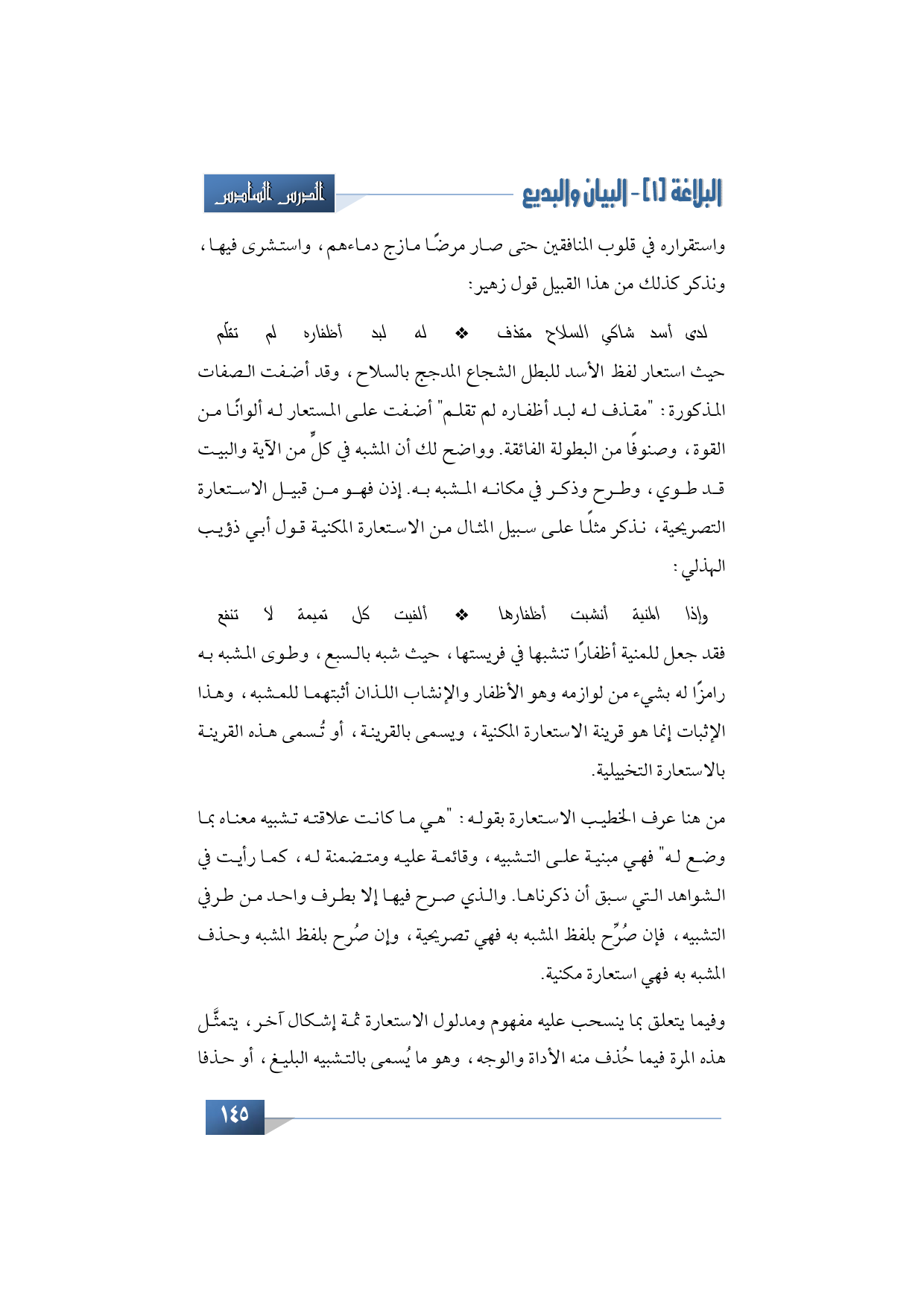 حيث استعار لفظ الأسد للبطل الشجاع المدجج بالسلاح، وقد أضفت الصفات المذكورة "مقذف له لبد أظفاره لم تقلم" أضفت على المستعار له ألوانًا من القوة، وصنوفًا من البطولة الفائقة. وواضح لك أن المشبه في كلٍّ من الآية والبيت قد طوي، وطرح وذكر في مكانه المشبه به. إذن فهو من قبيل الاستعارة التصريحية، نذكر مثلًا على سبيل المثال من الاستعارة المكنية قول أبي ذؤيب الهذلي: