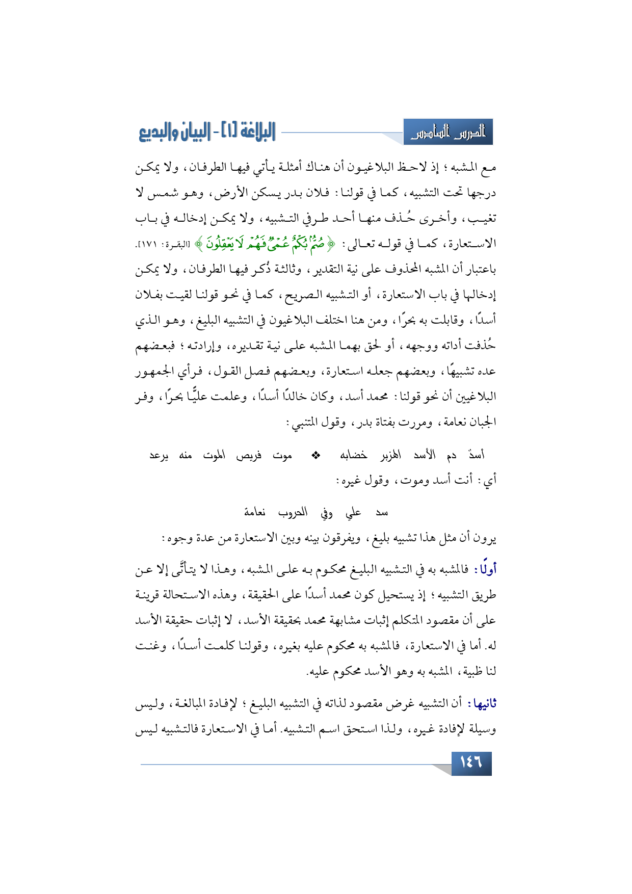 مع المشبه؛ إذ لاحظ البلاغيون أن هناك أمثلة يأتي فيها الطرفان، ولا يمكن درجها تحت التشبيه، كما في قولنا: فلان بدر يسكن الأرض، وهو شمس لا تغيب، وأخرى حُذف منها أحد طرفي التشبيه، ولا يمكن إدخاله في باب الاستعارة، كما في قوله تعالى: {صُمٌّ بُكْمٌ عُمْيٌ فَهُمْ لَا يَعْقِلُونَ} (البقرة: 171) باعتبار أن المشبه المحذوف على نية التقدير، وثالثة ذُكر فيها الطرفان، ولا يمكن إدخالها في باب الاستعارة، أو التشبيه الصريح، كما في نحو قولنا لقيت بفلان أسدًا، وقابلت به بحرًا، ومن هنا اختلف البلاغيون في التشبيه البليغ، وهو الذي حُذفت أداته ووجه، أو لحق بهما المشبه على نية تقديره، وإرادته؛ فبعضهم عده تشبيهًا، وبعضهم جعله استعارة، وبعضهم فصل القول، فرأي الجمهور البلاغيين أن نحو قولنا: محمد أسد، وكان خالدًا أسدًا، وعلمت عليًّا بحرًا، وفر الجبان نعامة، ومررت بفتاة بدر، وقول المتنبي: