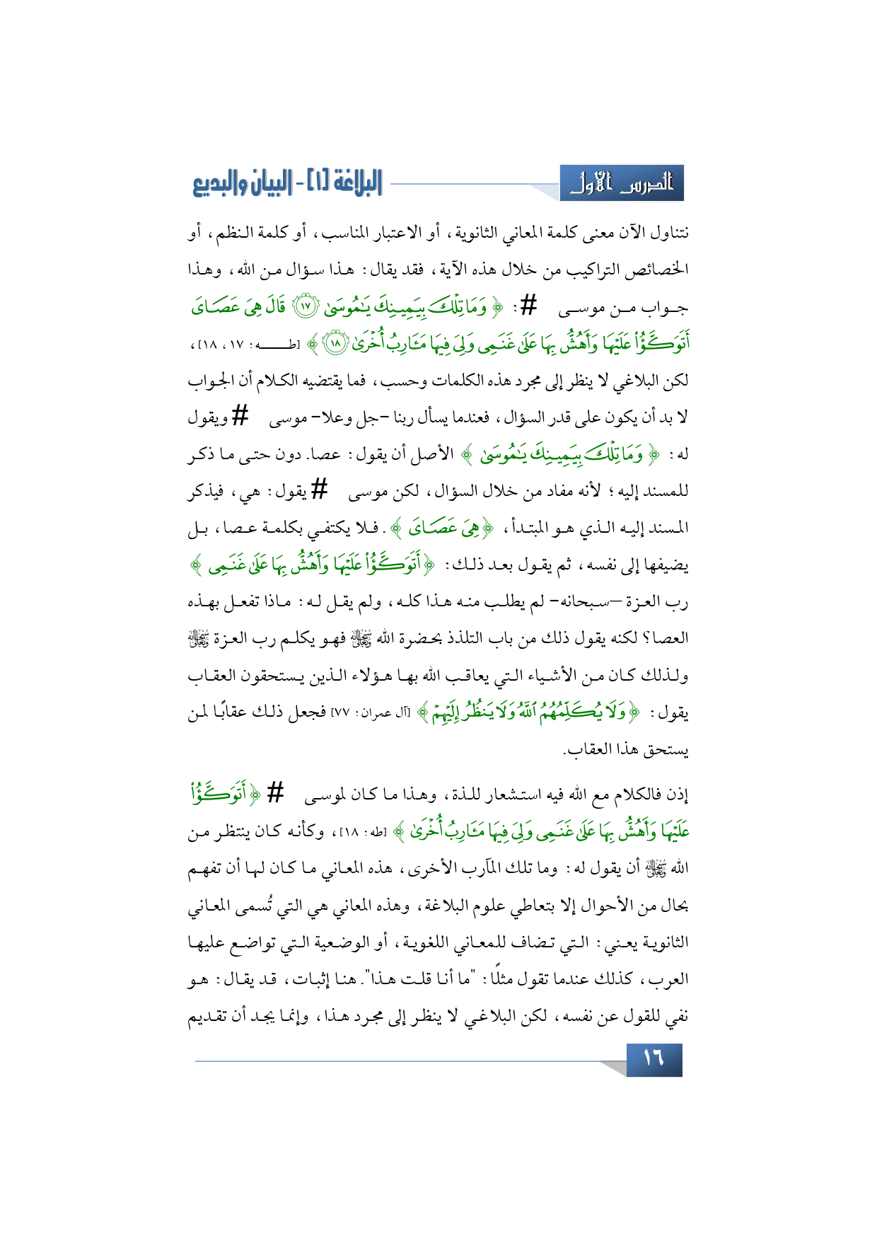 إذن فالكلام مع الله فيه استشعار للذة، وهذا ما كان لموسى -عليه السلام- {أَتَوَكَّأُ عَلَيْهَا وَأَهُشُّ بِهَا عَلَى غَنَمِي وَلِيَ فِيهَا مَآرِبُ أُخْرَى} (طه: 18)، وكأنه كان ينتظر من الله -سبحانه وتعالى- أن يقول له: وما تلك المآرب الأخرى، هذه المعاني ما كان لها أن تفهم بحال من الأحوال إلا بتعاطي علوم البلاغة، وهذه المعاني هي التي تُسمى المعاني الثانوية يعني: التي تضاف للمعاني اللغوية، أو الوضعية التي تواضع عليها العرب، كذلك عندما تقول مثلًا: ما أنا قلت هذا، هنا إثبات، أي واحد ممكن أن يقول: هو نفي للقول عن نفسه، لكن البلاغي لا ينظر إلى مجرد هذا، وإنما يجد أن هنا تقديم