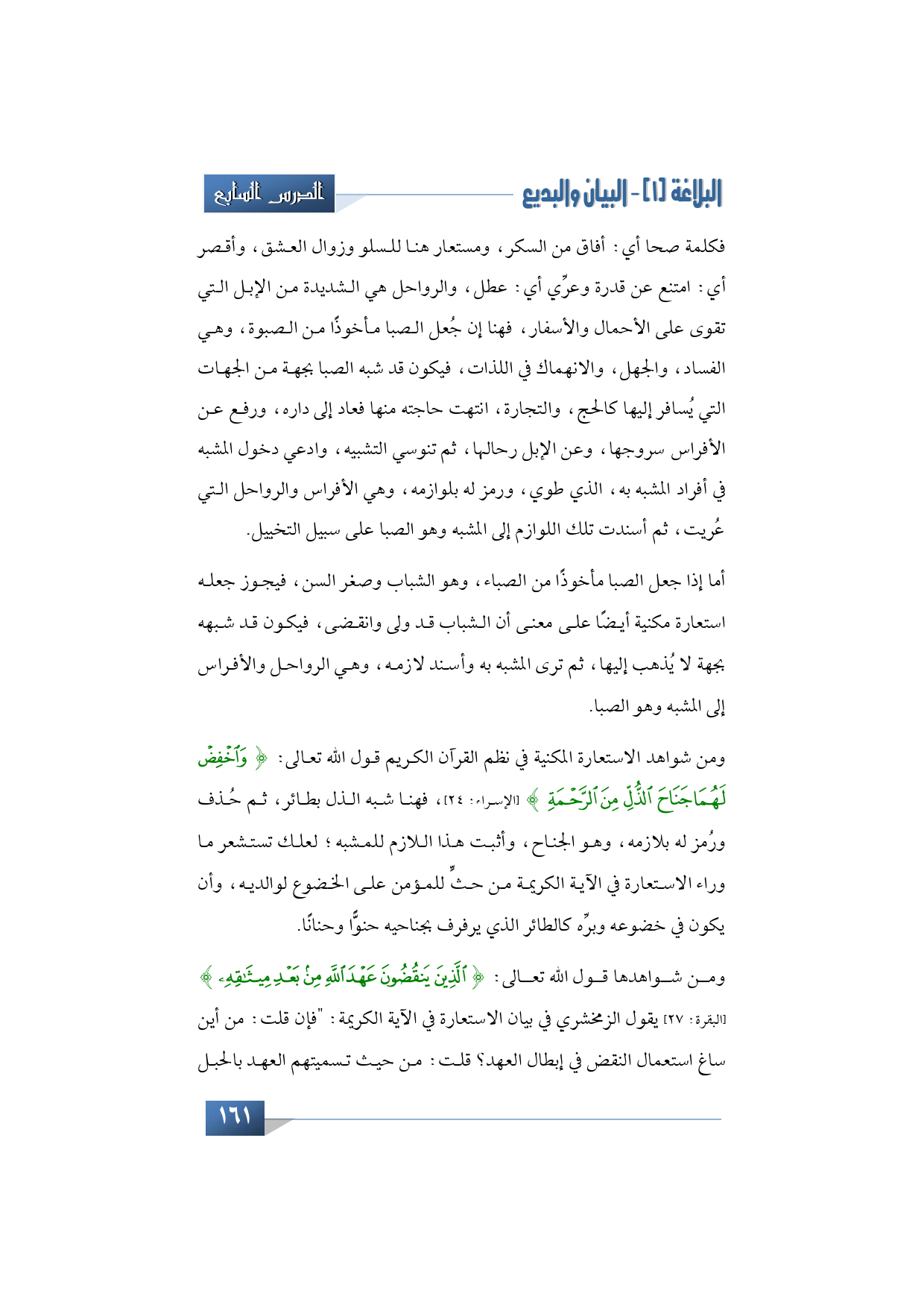 أما إذا جعل الصبا مأخوذًا من الصباء، وهو الشباب وصغر السن، فيجوز جعله استعارة مكنية أيضًا على معنى أن الشباب قد ولى وانقضى، فيكون قد شبهه بجهة لا يُذهب إليها، ثم ترى المشبه به وأسند لازمه، وهي الرواحل والأفراس إلى المشبه وهو الصبا.