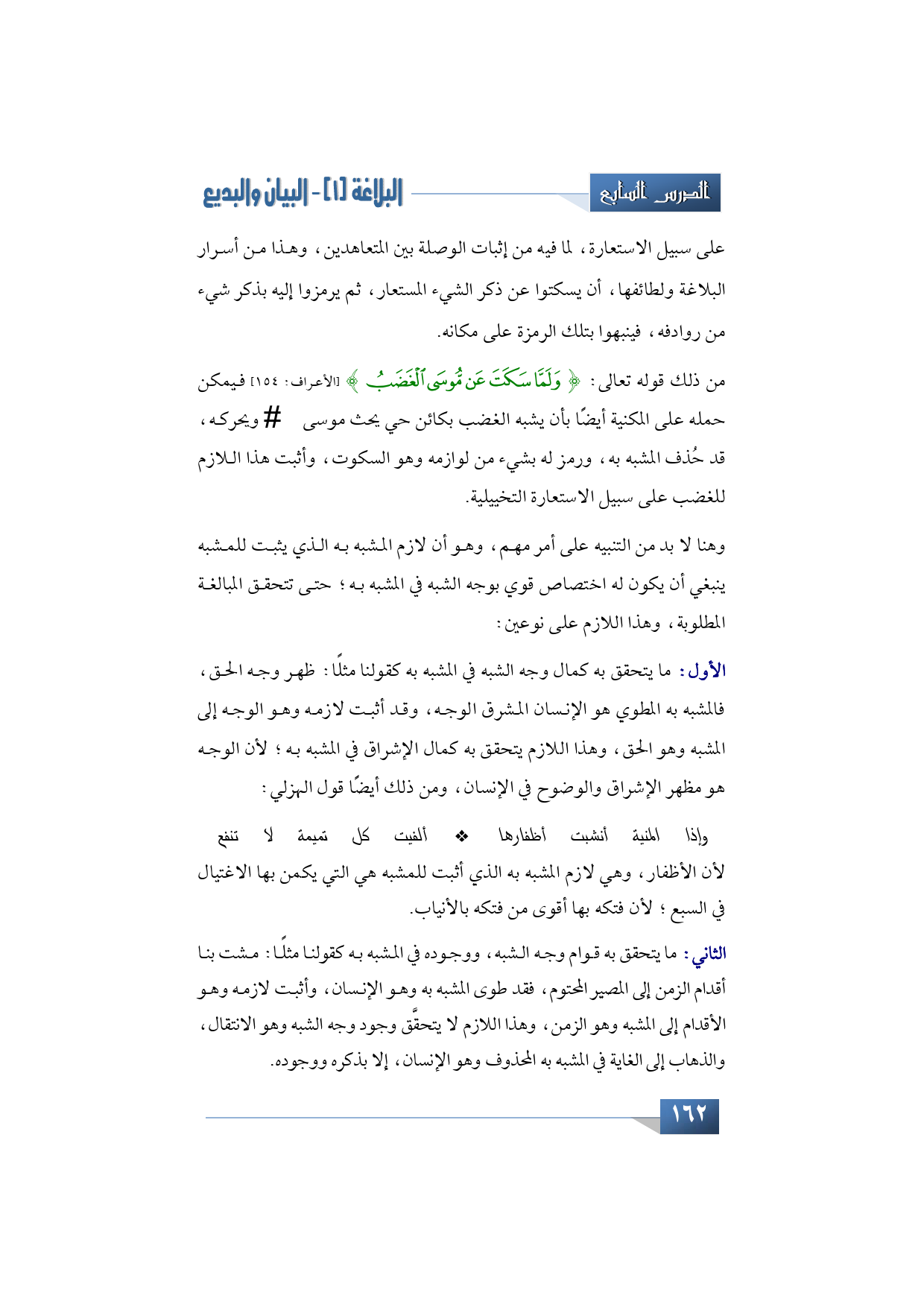وهنا لا بد من التنبيه على أمر مهم، وهو أن لازم المشبه به الذي يثبت للمشبه ينبغي أن يكون له اختصاص قوي بوجه الشبه في المشبه به؛ حتى تتحقق المبالغة المطلوبة، وهذا اللازم على نوعين: