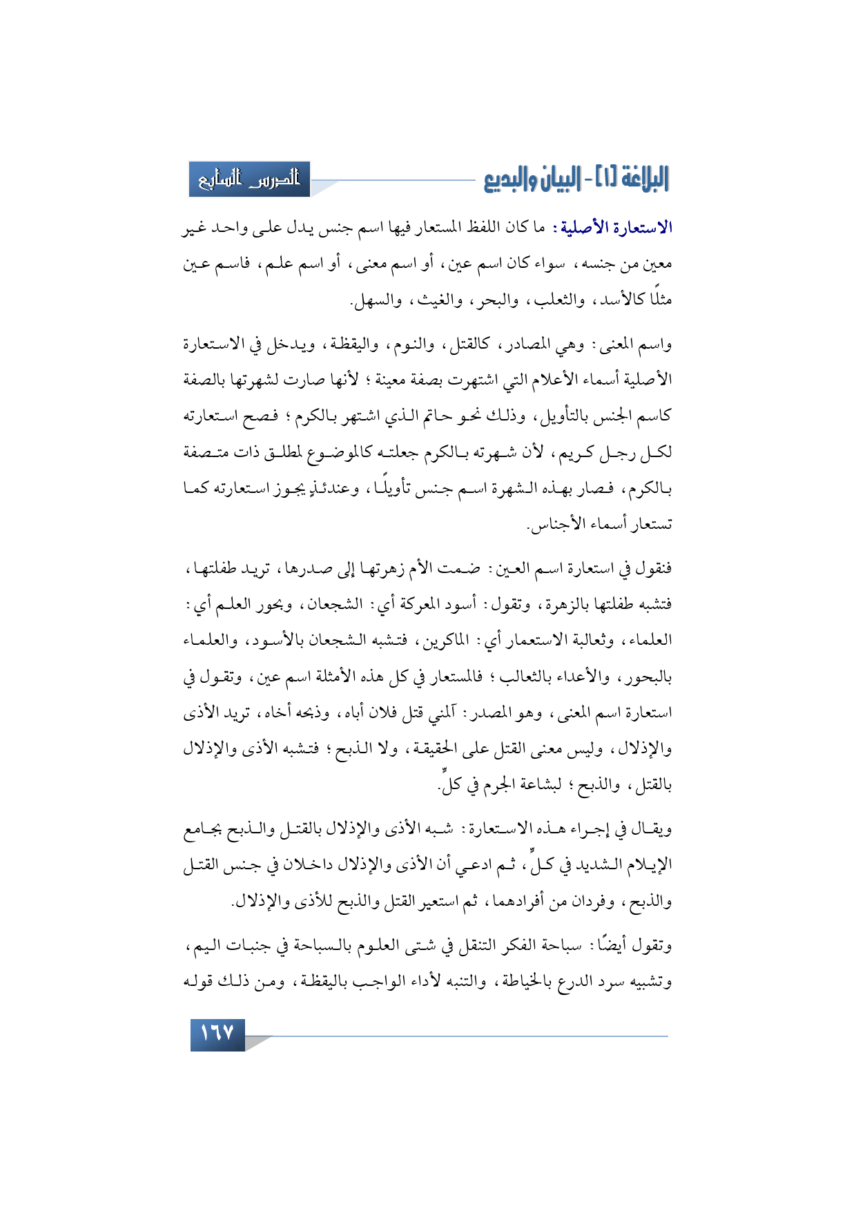 واسم المعنى: وهي المصادر، كالقتل، والنوم، واليقظة، ويدخل في الاستعارة الأصلية أسماء الأعلام التي اشتهرت بصفة معينة؛ لأنها صارت لشهرتها بالصفة كاسم الجنس بالتأويل، وذلك نحو حاتم الذي اشتهر بالكرم؛ فصح استعارته لكل رجل كريم، لأن شهرته بالكرم جعلته كالموضوع لمطلق ذات متصفة بالكرم، فصار بهذه الشهرة اسم جنس تأويلًا، وعندئذٍ يجوز استعارته كما تستعار أسماء الأجناس.