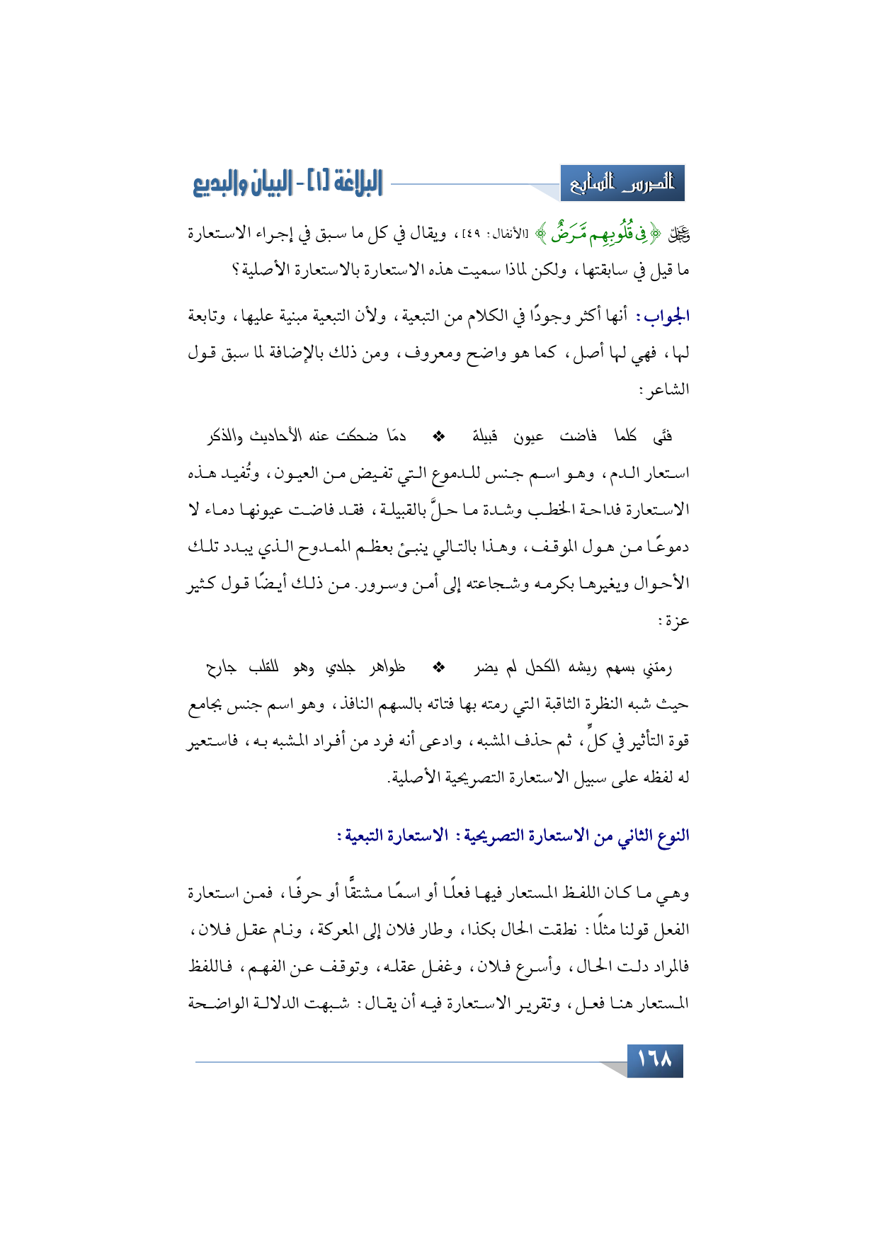 -عز وجل- {فِي قُلُوبِهِمْ مَرَضٌ} (الأنفال: 49)، ويقال في كل ما سبق في إجراء الاستعارة ما قيل في سابقتها، ولكن لماذا سميت هذه الاستعارة بالاستعارة الأصلية؟ الجواب: أنها أكثر وجودًا في الكلام من التبعية، ولأن التبعية مبنية عليها، وتابعة لها، فهي لها أصل، كما هو واضح ومعروف، ومن ذلك بالإضافة لما سبق قول الشاعر: