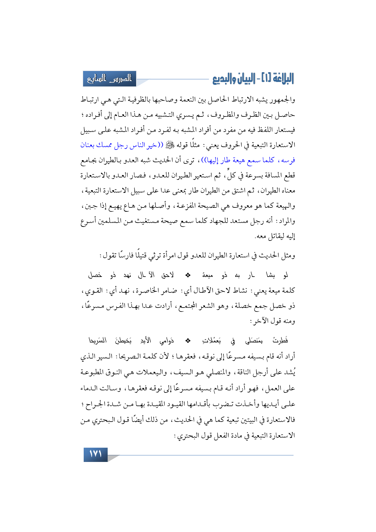 والجمهور يشبه الارتباط الحاصل بين النعمة وصاحبها بالظرفية التي هي ارتباط حاصل بين الظرف والمظروف، ثم يسري التشبيه من هذا العام إلى أفراده؛ فيستعار اللفظ فيه من مفرد من أفراد المشبه به لفرد من أفراد المشبه على سبيل الاستعارة التبعية في الحروف يعني: مثلًا قوله -صلى الله عليه وسلم ((خير الناس رجل ممسك بعنان فرسه، كلما سمع هيعة طار إليها))، ترى أن الحديث شبه العدو بالطيران بجامع قطع المسافة بسرعة في كلٍّ، ثم استعير الطيران للعدو، فصار العدو بالاستعارة معناه الطيران، ثم اشتق من الطيران طار بمعنى عدا على سبيل الاستعارة التبعية، والهيعة كما هو معروف هي الصيحة المفزعة، وأصلها من هاع يهيع إذا جبن، والمراد: أنه رجل مستعد للجهاد كلما سمع صيحة مستغيث من المسلمين أسرع إليه ليقاتل معه.