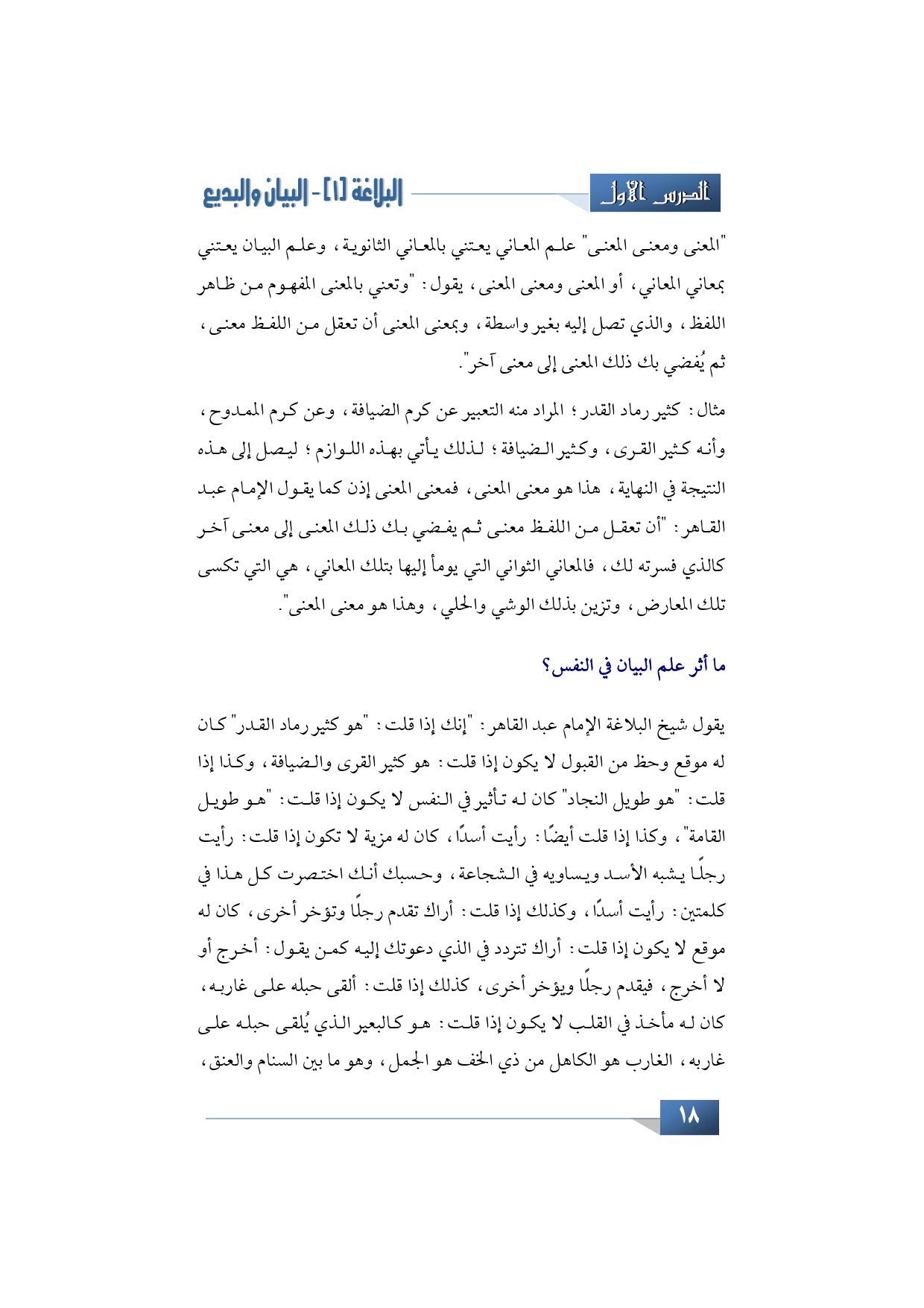 "المعنى ومعنى المعنى" علم المعاني يعتني بالمعاني الثانوية، علم البيان يعتني بمعاني المعاني، أو المعنى ومعنى المعنى، يقول: "وتعني بالمعنى المفهوم من ظاهر اللفظ، والذي تصل إليه بغير واسطة، وبمعنى المعنى أن تعقل من اللفظ معنى، ثم يُفضي بك ذلك المعنى إلى معنى آخر كالذي فسرته لك"،