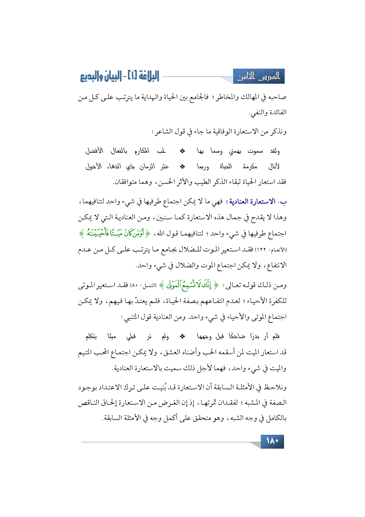 أما الاستعارة العنادية: فهي ما لا يمكن اجتماع طرفيها في شيء واحد لتنافيهما، وهذا لا يقدح في جمال هذه الاستعارة كما سنبين، ومن العنادية التي لا يمكن اجتماع طرفيها في شيء واحد؛ لتنافيهما قول الله، {أَوَمَنْ كَانَ مَيْتًا فَأَحْيَيْنَاهُ} (الأنعام: 122) فقد استعير الموت للضلال بجامع ما يترتب على كل من عدم الانتفاع، ولا يمكن اجتماع الموت والضلال في شيء واحد.
