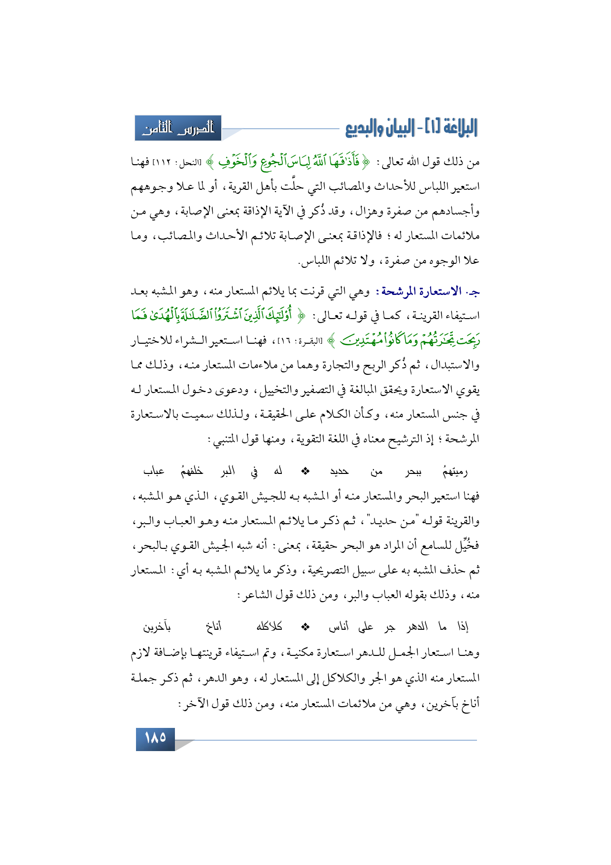 فهنا استعير البحر والمستعار منه أو المشبه به للجيش القوي، الذي هو المشبه، والقرينة قوله "من حديد"، ثم ذكر ما يلائم المستعار منه وهو العباب والبر، فخُيِّل للسامع أن المراد هو البحر حقيقة، بمعنى: أنه شبه الجيش القوي بالبحر، ثم حذف المشبه به على سبيل التصريحية، وذكر ما يلائم المشبه به أي: المستعار منه، وذلك بقوله العباب والبر، ومن ذلك قول الشاعر: