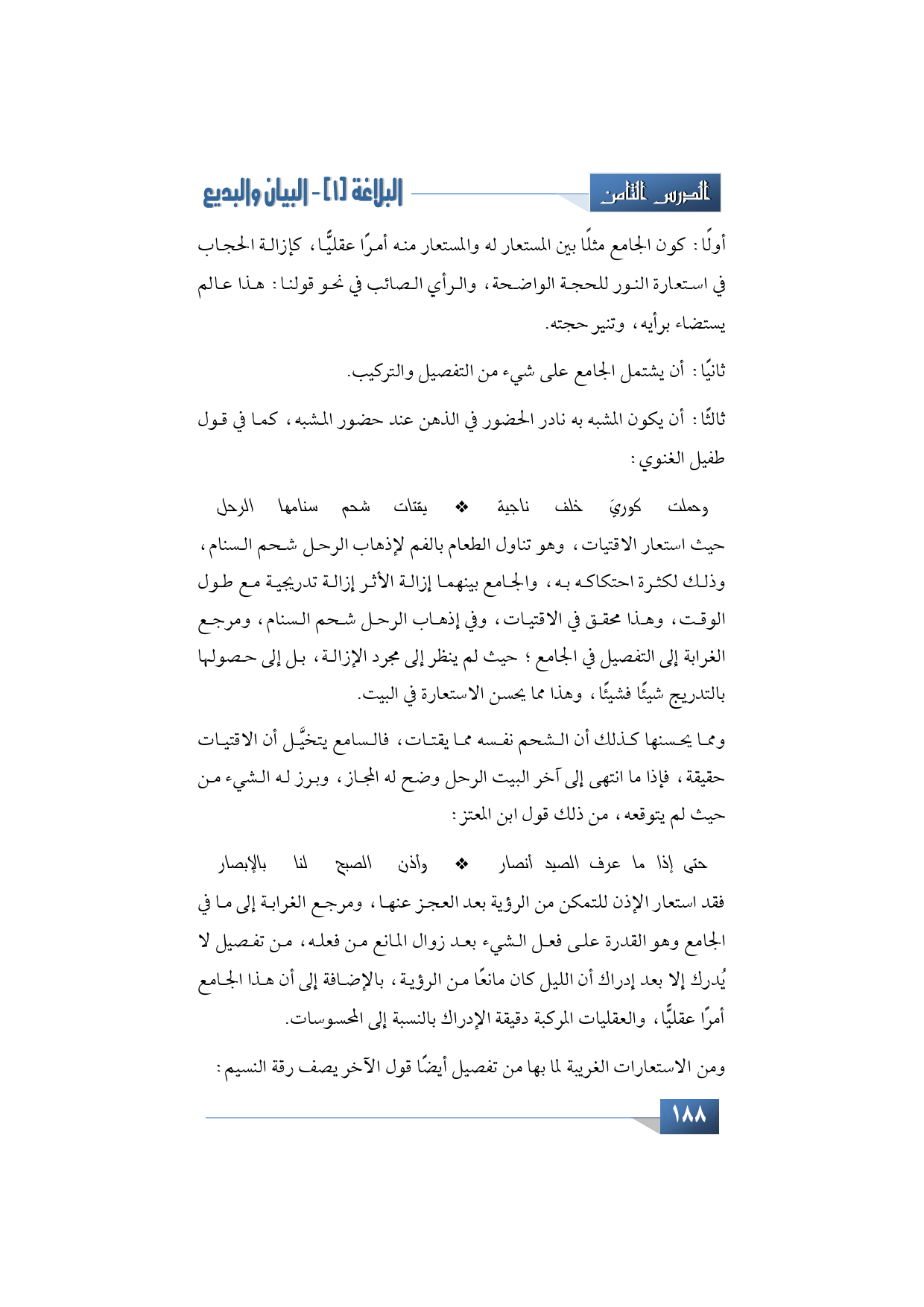 ومما يحسنها كذلك أن الشحم نفسه مما يقتات، فالسامع يتخيَّل أن الاقتيات حقيقة، فإذا ما انتهى إلى آخر البيت الرحل وضح له المجاز، وبرز له الشيء من حيث لم يتوقعه، من ذلك قول ابن المعتز: