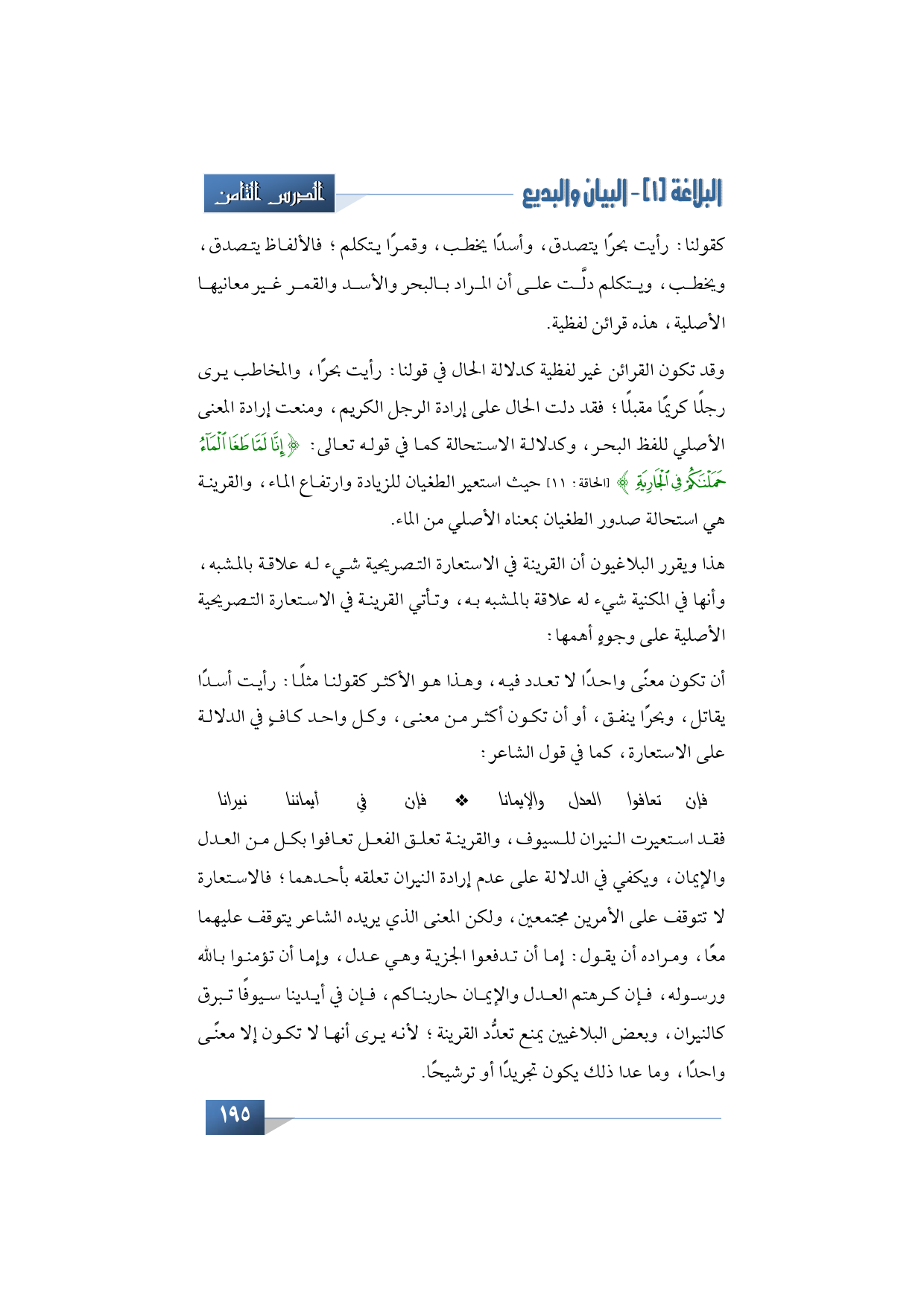 فقد استعيرت النيران للسيوف، والقرينة تعلق الفعل تعافوا بكل من العدل والإيمان، ويكفي في الدلالة على عدم إرادة النيران تعلقه بأحدهما؛ فالاستعارة لا تتوقف على الأمرين مجتمعين، ولكن المعنى الذي يريده الشاعر يتوقف عليهما معًا، ومراده أن يقول: إما أن تدفعوا الجزية وهي عدل، وإما أن تؤمنوا بالله ورسوله، فإن كرهتم العدل والإيمان حاربناكم، فإن في أيدينا سيوفًا تبرق كالنيران، وبعض البلاغيين يمنع تعدُّد القرينة، لماذا؟ لأنه يرى أنها لا تكون إلا معنًى واحدًا، وما عدا ذلك يكون تجريدًا أو ترشيحًا.