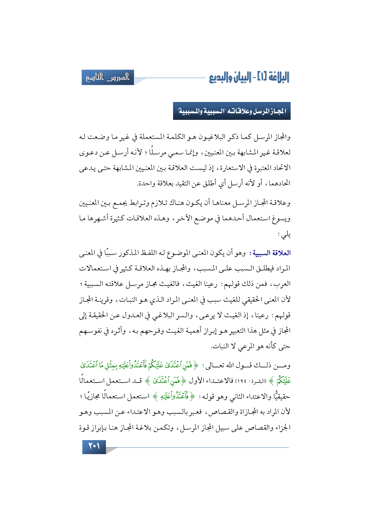 ومن ذلك قول الله تعالى: {فَمَنِ اعْتَدَى عَلَيْكُمْ فَاعْتَدُوا عَلَيْهِ بِمِثْلِ مَا اعْتَدَى عَلَيْكُمْ} (البقرة: 194) فالاعتداء الأول {فَمَنِ اعْتَدَى} قد استعمل استعمالًا حقيقيًّا والاعتداء الثاني وهو قوله: {فَاعْتَدُوا عَلَيْهِ} استعمل استعمالًا مجازيًا؛ لأن المراد به المجازاة والقصاص، فعبر بالسبب وهو الاعتداء عن المسبب وهو الجزاء والقصاص على سبيل المجاز المرسل، وتكمن بلاغة المجاز هنا بإبراز قوة