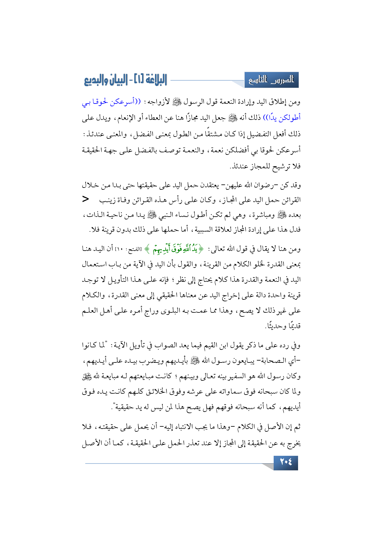 ومن إطلاق اليد وإرادة النعمة قول الرسول -صلى الله عليه وسلم- لأزواجه: ((أسرعكن لحوقا بي أطولكن يدًا)) ذلك أنه -صلى الله عليه وسلم- جعل اليد مجازًا هنا عن العطاء أو الإنعام، ويدل على ذلك أفعل التفضيل إذا كان مشتقًا من الطول بمعنى الفضل، والمعنى عندئذ: أسرعكن لحوقا بي أفضلكن نعمة، والنعمة توصف بالفضل على جهة الحقيقة فلا ترشيح للمجاز عندئذ.