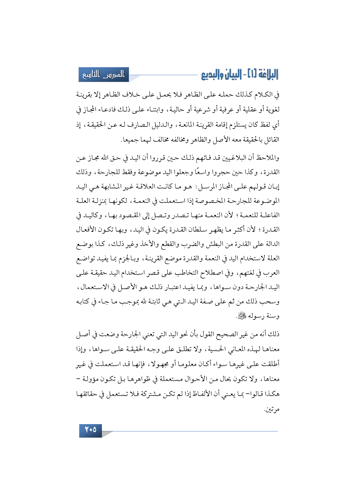 والملاحظ أن البلاغيين قد فاتهم ذلك حين قرروا أن اليد في حق الله مجاز عن القدرة، وكذا حين حجروا واسعًا وجعلوا اليد موضوعة وفقط للجارحة، وذلك إبان قولهم على المجاز المرسل: هو ما كانت العلاقة غير المشابهة هي اليد الموضوعة للجارحة المخصوصة إذا استعملت في النعمة، لكونها بمنزلة العلة الفاعلة للنعمة؛ لأن النعمة منها تصدر وتصل إلى المقصود بها، وكاليد في القدرة؛ لأن أكثر ما يظهر سلطان القدرة يكون في اليد، وبها تكون الأفعال الدالة على القدرة من البطش والضرب والقطع والأخذ وغير ذلك، كذا بوضع العلة لاستخدام اليد في النعمة والقدرة موضع القرينة، وبالجزم بما يفيد تواضع العرب في لغتهم، وفي اصطلاح التخاطب على قصر استخدام اليد حقيقة على اليد الجارحة دون سواها، وبما يفيد اعتبار ذلك هو الأصل في الاستعمال، وسحب ذلك من ثم على صفة اليد التي هي ثابتة لله بموجب ما جاء في كتابه وسنة رسوله -صلى الله عليه وسلم.