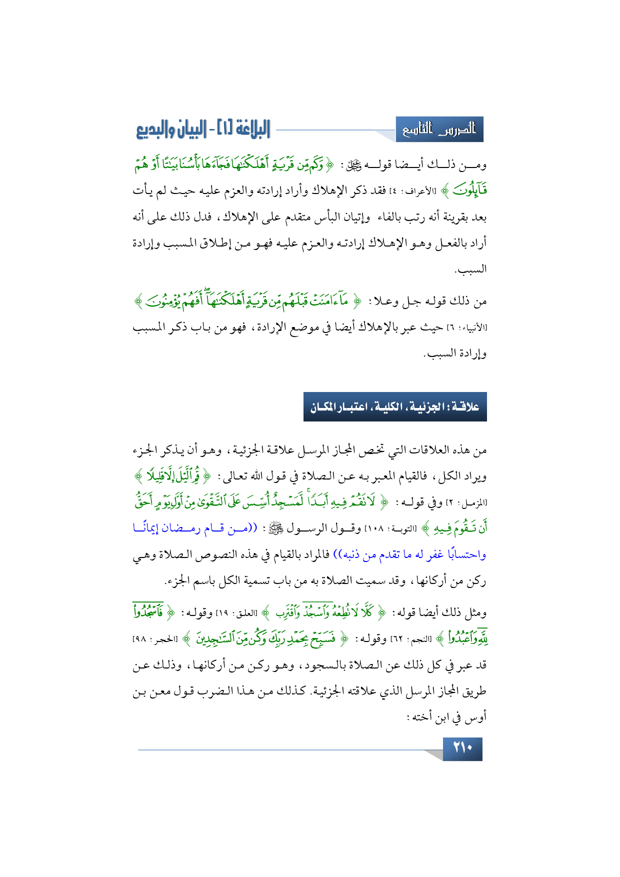 ومثل ذلك أيضا قوله: {كَلَّا لَا تُطِعْهُ وَاسْجُدْ وَاقْتَرِبْ} (العلق: 19) وقوله: {فَاسْجُدُوا لِلَّهِ وَاعْبُدُوا} (النجم: 62) وقوله: {فَسَبِّحْ بِحَمْدِ رَبِّكَ وَكُنْ مِنَ السَّاجِدِينَ} (الحجر: 98) قد عبر في كل ذلك عن الصلاة بالسجود، وهو ركن من أركانها، وذلك عن طريق المجاز المرسل الذي علاقته الجزئية. كذلك من هذا الضرب قول معن بن أوس في ابن أخته:
