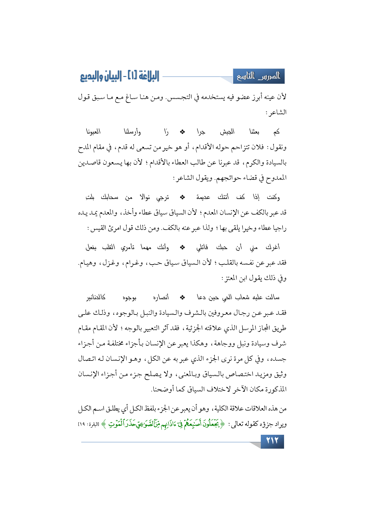 فقد عبر عن رجال معروفين بالشرف والسيادة والنبل بالوجوه، وذلك على طريق المجاز المرسل الذي علاقته الجزئية، فقد آثر التعبير بالوجه؛ لأن المقام مقام شرف وسيادة ونبل ووجاهة، وهكذا يعبر عن الإنسان بأجزاء مختلفة من أجزاء جسده، وفي كل مرة نرى الجزء الذي عبر به عن الكل، وهو الإنسان له اتصال وثيق ومزيد اختصاص بالسياق وبالمعنى، ولا يصلح جزء من أجزاء الإنسان المذكورة مكان الآخر لاختلاف السياق كما أوضحنا.