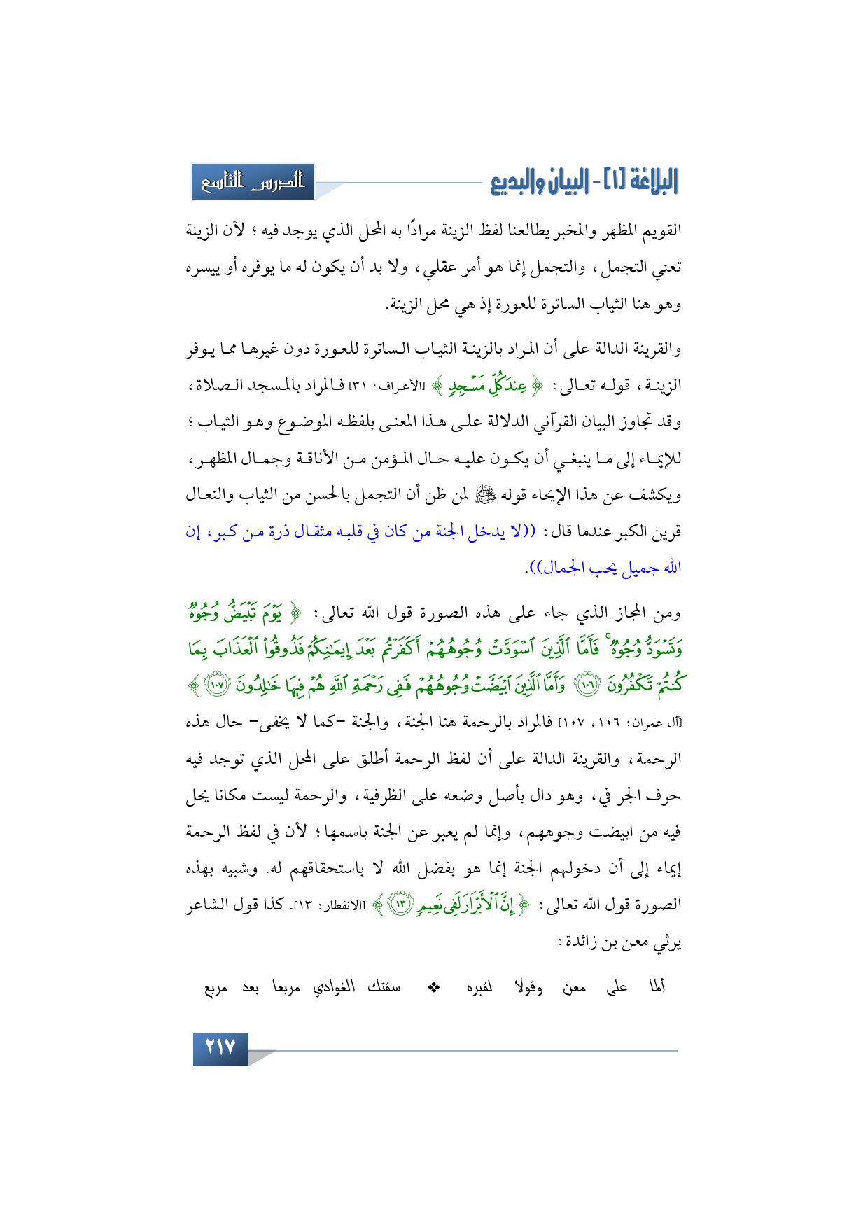 ومن المجاز الذي جاء على هذه الصورة قول الله تعالى: {يَوْمَ تَبْيَضُّ وُجُوهٌ وَتَسْوَدُّ وُجُوهٌ فَأَمَّا الَّذِينَ اسْوَدَّتْ وُجُوهُهُمْ أَكَفَرْتُمْ بَعْدَ إِيمَانِكُمْ فَذُوقُوا الْعَذَابَ بِمَا كُنْتُمْ تَكْفُرُونَ * وَأَمَّا الَّذِينَ ابْيَضَّتْ وُجُوهُهُمْ فَفِي رَحْمَةِ اللَّهِ هُمْ فِيهَا خَالِدُونَ} (آل عمران: 106، 107) فالمراد بالرحمة هنا الجنة، والجنة -كما لا يخفى- حال هذه الرحمة، والقرينة الدالة على أن لفظ الرحمة أطلق على المحل الذي توجد فيه حرف الجر في، وهو دال بأصل وضعه على الظرفية، والرحمة ليست مكانا يحل فيه من ابيضت وجوههم، وإنما لم يعبر عن الجنة باسمها؛ لأن في لفظ الرحمة إيماء إلى أن دخولهم الجنة إنما هو بفضل الله لا باستحقاقهم له. وشبيه بهذه الصورة قول الله تعالى: {إِنَّ الْأَبْرَارَ لَفِي نَعِيمٍ} (الانفطار: 13). كذا قول الشاعر يرثي معن بن زائدة: