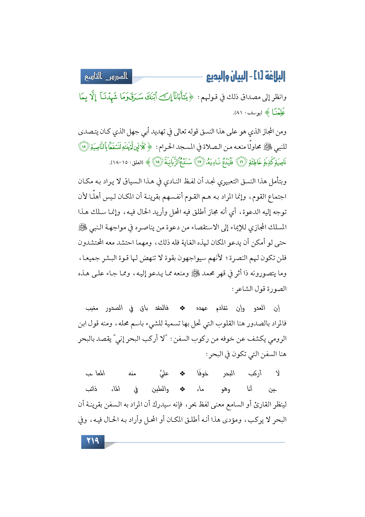 لينظر القارئ أو السامع معنى لفظ بحر، فإنه سيدرك أن المراد به السفن بقرينة أن البحر لا يركب، ومؤدى هذا أنه أطلق المكان أو المحل وأراد به الحال فيه، وفي