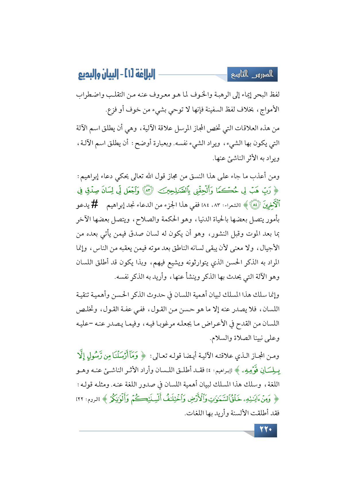 ومن أعذب ما جاء على هذا النسق من مجاز قول الله تعالى يحكي دعاء إبراهيم: {رَبِّ هَبْ لِي حُكْمًا وَأَلْحِقْنِي بِالصَّالِحِينَ * وَاجْعَلْ لِي لِسَانَ صِدْقٍ فِي الْآخِرِينَ} (الشعراء: 83، 84) ففي هذا الجزء من الدعاء نجد إبراهيم -عليه السلام- يدعو بأمور يتصل بعضها بالحياة الدنيا، وهو الحكمة والصلاح، ويتصل بعضها الآخر بما بعد الموت وقبل النشور، وهو أن يكون له لسان صدق فيمن يأتي بعده من الأجيال، ولا معنى لأن يبقى لسانه الناطق بعد موته فيمن يعقبه من الناس، وإنما المراد به الذكر الحسن الذي يتوارثونه ويشيع فيهم، وبذا يكون قد أطلق اللسان وهو الآلة التي يحدث بها الذكر وينشأ عنها، وأريد به الذكر نفسه.