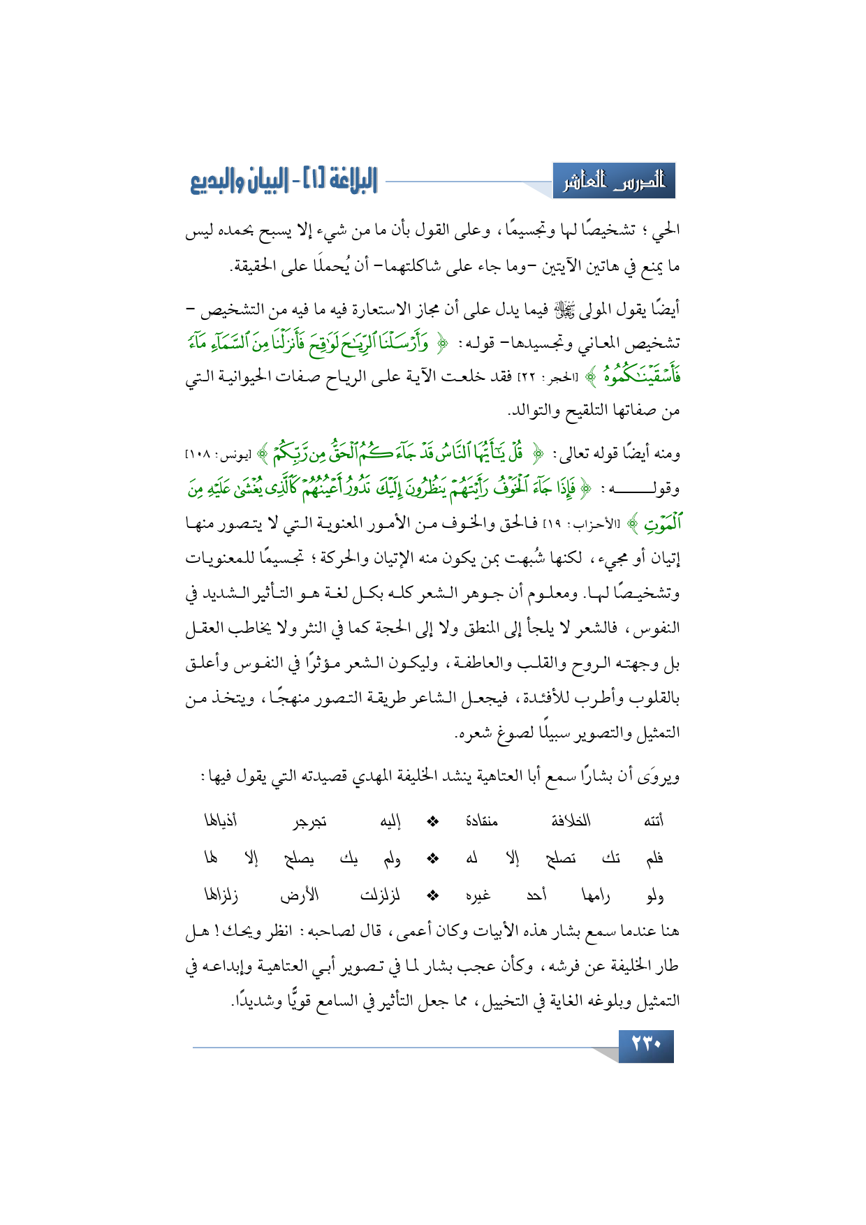 ومنه أيضًا قوله تعالى: {قُلْ يَا أَيُّهَا النَّاسُ قَدْ جَاءَكُمُ الْحَقُّ مِنْ رَبِّكُمْ} (يونس: 108) وقوله: {فَإِذَا جَاءَ الْخَوْفُ رَأَيْتَهُمْ يَنْظُرُونَ إِلَيْكَ تَدُورُ أَعْيُنُهُمْ كَالَّذِي يُغْشَى عَلَيْهِ مِنَ الْمَوْتِ} (الأحزاب: 19) فالحق والخوف من الأمور المعنوية التي لا يتصور منها إتيان أو مجيء، لكنها شُبهت بمن يكون منه الإتيان والحركة؛ تجسيمًا للمعنويات وتشخيصًا لها. ومعلوم أن جوهر الشعر كله بكل لغة هو التأثير الشديد في النفوس، فالشعر لا يلجأ إلى المنطق ولا إلى الحجة كما في النثر ولا يخاطب العقل بل وجهته الروح والقلب والعاطفة، وليكون الشعر مؤثرًا في النفوس وأعلق بالقلوب وأطرب للأفئدة، فيجعل الشاعر طريقة التصور منهجًا، ويتخذ من التمثيل والتصوير سبيلًا لصوغ شعره.