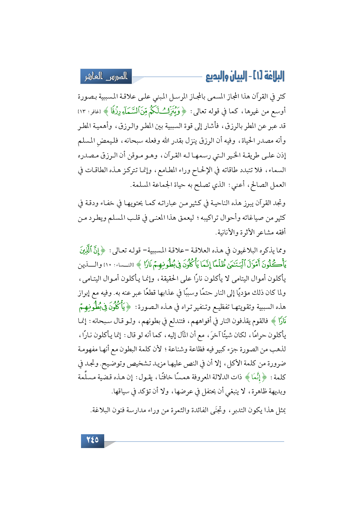 ومما يذكره البلاغيون في هذه العلاقة -علاقة المسببية- قوله تعالى: {إِنَّ الَّذِينَ يَأْكُلُونَ أَمْوَالَ الْيَتَامَى ظُلْمًا إِنَّمَا يَأْكُلُونَ فِي بُطُونِهِمْ نَارًا} (النساء: 10) والذين يأكلون أموال اليتامى لا يأكلون نارًا على الحقيقة، وإنما يأكلون أموال اليتامى، ولما كان ذلك مؤديًا إلى النار حتمًا وسببًا في عذابها قطعًا عبر عنه به. وفيه مع إبراز هذه السببية وتقويتها تفظيع وتنفير تراه في هذه الصورة: {يَأْكُلُونَ فِي بُطُونِهِمْ نَارًا} فالقوم يقذفون النار في أفواههم، فتندلع في بطونهم، ولو قال سبحانه: إنما يأكلون حرامًا، لكان شيئًا آخرَ، مع أن المآل إليه، كما أنه لو قال: إنما يأكلون نارًا، لذهب من الصورة جزء كبير فيه فظاعة وشناعة؛ لأن كلمة البطون مع أنها مفهومة ضرورة من كلمة الأكل، إلا أن في النص عليها مزيد تشخيص وتوضيح. وتجد في كلمة: {إِنَّمَا} ذات الدلالة المعروفة همسًا خافتًا، يقول: إن هذه قضية مسلَّمة وبديهة ظاهرة، لا ينبغي أن يحتفل في عرضها، ولا أن تؤكد في سياقها.