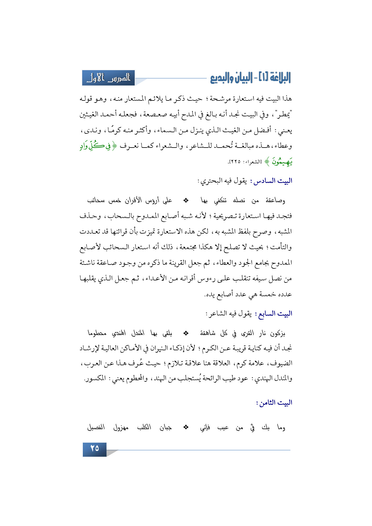 هذا البيت فيه استعارة مرشحة حيث ذكر ما يلائم المستعار منه، وهو قوله "يمطر"، وفي البيت نجد أنه بالغ في المدح أبيه صعصعة، فجعله أحمد الغيثين يعني: أفضل من الغيث الذي ينزل من السماء، وأكثر منه كرمًا، وندى، وعطاء، هذه مبالغة تُحمد للشاعر، والشعراء كما نعرف {فِي كُلِّ وَادٍ يَهِيمُونَ} (الشعراء: 225).