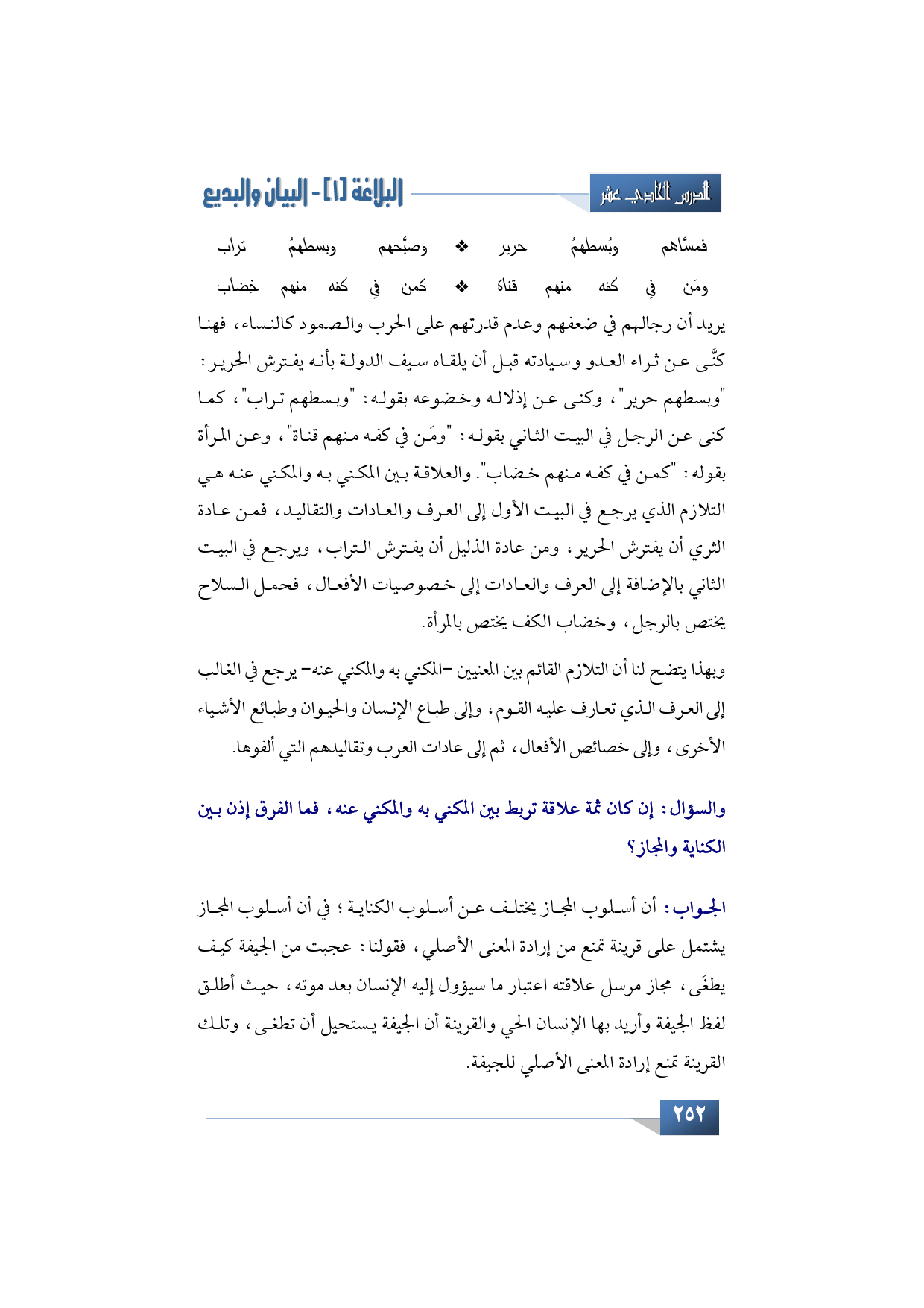 يريد أن رجالهم في ضعفهم وعدم قدرتهم على الحرب والصمود كالنساء، فهنا كنَّى عن ثراء العدو وسيادته قبل أن يلقاه سيف الدولة بأنه يفترش الحرير: "وبسطهم حرير"، وكنى عن إذلاله وخضوعه بقوله: "وبسطهم تراب"، كما كنى عن الرجل في البيت الثاني بقوله: "ومَن في كفه منهم قناة"، وعن المرأة بقوله: "من في كفه منهم خضاب". والعلاقة بين المكني به والمكني عنه هي التلازم الذي يرجع في البيت الأول إلى العرف والعادات والتقاليد، فمن عادة الثري أن يفترش الحرير، ومن عادة الذليل أن يفترش التراب، ويرجع في البيت الثاني بالإضافة إلى العرف والعادات إلى خصوصيات الأفعال، فحمل السلاح يختص بالرجل، وخضاب الكف يختص بالمرأة.