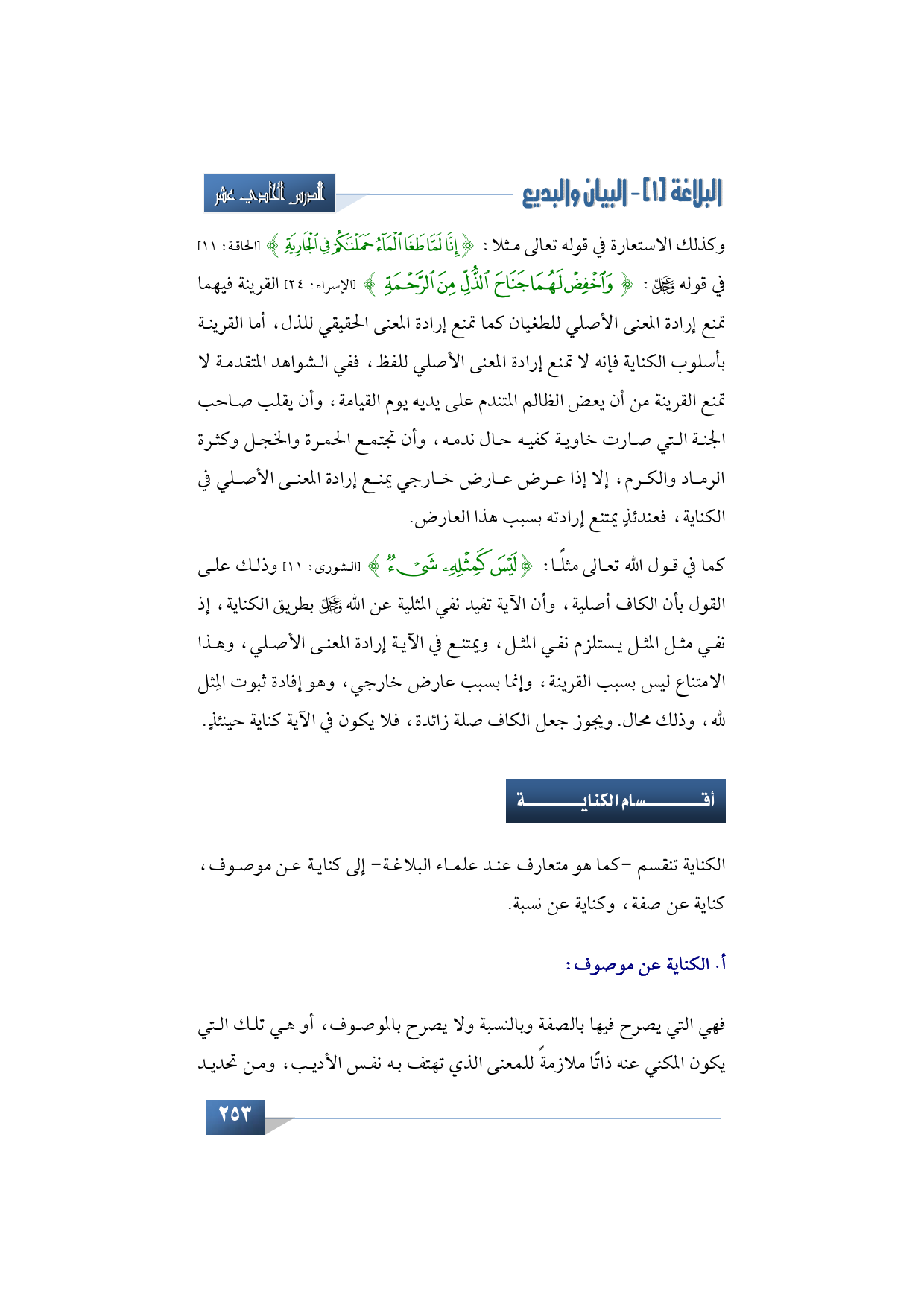 وكذلك الاستعارة في قوله تعالى مثلا: {إِنَّا لَمَّا طَغَى الْمَاءُ حَمَلْنَاكُمْ فِي الْجَارِيَةِ} (الحاقة: 11) في قوله -عز وجل-: {وَاخْفِضْ لَهُمَا جَنَاحَ الذُّلِّ مِنَ الرَّحْمَةِ} (الإسراء: 24) القرينة فيهما تمنع إرادة المعنى الأصلي للطغيان كما تمنع إرادة المعنى الحقيقي للذل، أما القرينة بأسلوب الكناية فإنه لا تمنع إرادة المعنى الأصلي للفظ، ففي الشواهد المتقدمة لا تمنع القرينة من أن يعض الظالم المتندم على يديه يوم القيامة، وأن يقلب صاحب الجنة التي صارت خاوية كفيه حال ندمه، وأن تجتمع الحمرة والخجل وكثرة الرماد والكرم، إلا إذا عرض عارض خارجي يمنع إرادة المعنى الأصلي في الكناية، فعندئذٍ يمتنع إرادته بسبب هذا العارض.