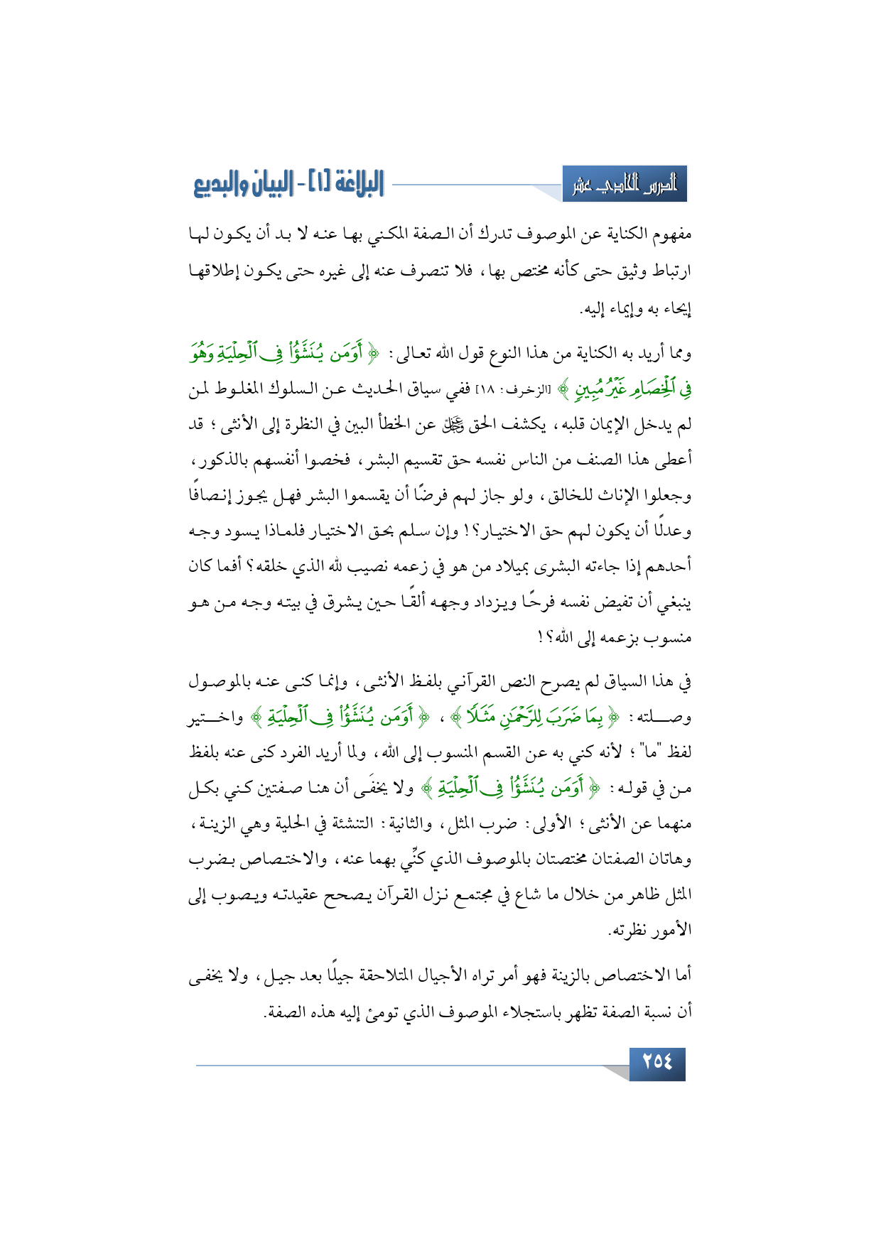 ومما أريد به الكناية من هذا النوع قول الله تعالى: {أَوَمَنْ يُنَشَّأُ فِي الْحِلْيَةِ وَهُوَ فِي الْخِصَامِ غَيْرُ مُبِينٍ} (الزخرف: 18) ففي سياق الحديث عن السلوك المغلوط لمن لم يدخل الإيمان قلبه، يكشف الحق -عز وجل- عن الخطأ البين في النظرة إلى الأنثى؛ قد أعطى هذا الصنف من الناس نفسه حق تقسيم البشر، فخصوا أنفسهم بالذكور، وجعلوا الإناث للخالق، ولو جاز لهم فرضًا أن يقسموا البشر فهل يجوز إنصافًا وعدلًا أن يكون لهم حق الاختيار؟! وإن سلم بحق الاختيار فلماذا يسود وجه أحدهم إذا جاءته البشرى بميلاد من هو في زعمه نصيب لله الذي خلقه؟ أفما كان ينبغي أن تفيض نفسه فرحًا ويزداد وجهه ألقًا حين يشرق في بيته وجه من هو منسوب بزعمه إلى الله؟!