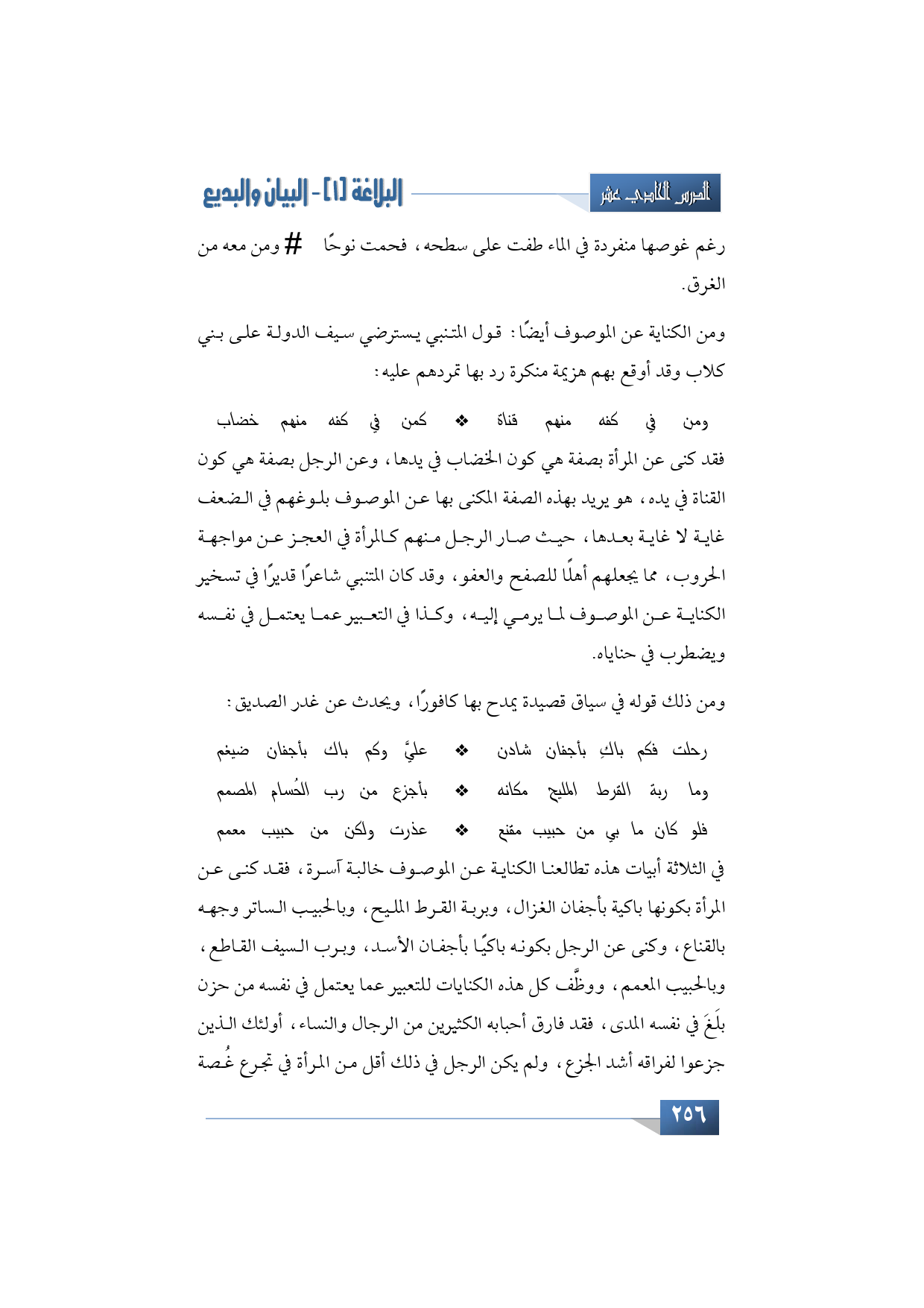 فقد كنى عن المرأة بصفة هي كون الخضاب في يدها، وعن الرجل بصفة هي كون القناة في يده، هو يريد بهذه الصفة المكنى بها عن الموصوف بلوغهم في الضعف غاية لا غاية بعدها، حيث صار الرجل منهم كالمرأة في العجز عن مواجهة الحروب، مما يجعلهم أهلًا للصفح والعفو، وقد كان المتنبي شاعرًا قديرًا في تسخير الكناية عن الموصوف لما يرمي إليه، وكذا في التعبير عما يعتمل في نفسه ويضطرب في حناياه.