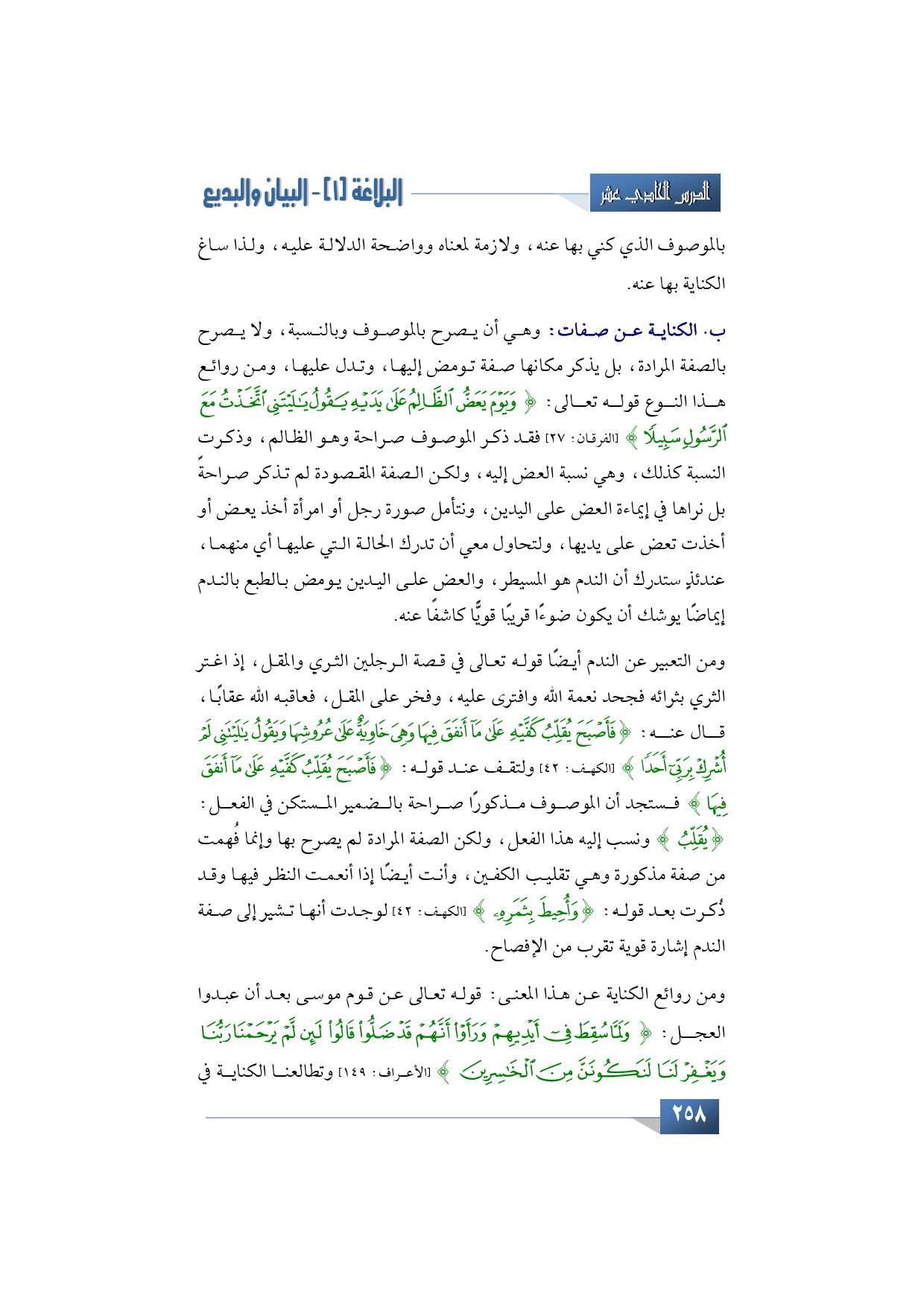 القسم الثاني من أقسام الكناية: الكناية عن صفات؛ وهي أن يصرح بالموصوف وبالنسبة، ولا يصرح بالصفة المرادة، بل يذكر مكانها صفة تومض إليها، وتدل عليها، ومن روائع هذا النوع قوله تعالى: {وَيَوْمَ يَعَضُّ الظَّالِمُ عَلَى يَدَيْهِ يَقُولُ يَا لَيْتَنِي اتَّخَذْتُ مَعَ الرَّسُولِ سَبِيلًا} (الفرقان: 27) فقد ذكر الموصوف صراحة وهو الظالم، وذكرت النسبة كذلك، وهي نسبة العض إليه، ولكن الصفة المقصودة لم تذكر صراحةًبل نراها في إيماءة العض على اليدين، ونتأمل صورة رجل أو امرأة أخذ يعض أو أخذت تعض على يديها، ولتحاول معي أن تدرك الحالة التي عليها أي منهما، عندئذٍ ستدرك أن الندم هو المسيطر، والعض على اليدين يومض بالطبع بالندم إيماضًا يوشك أن يكون ضوءًا قريبًا قويًّا كاشفًا عنه.