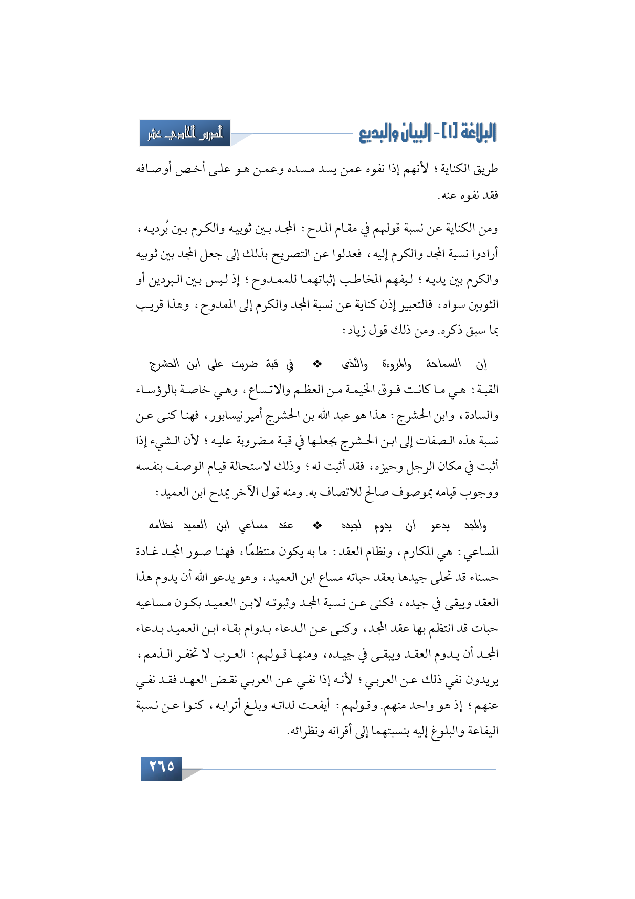 المساعي: هي المكارم، ونظام العقد: ما به يكون منتظمًا، فهنا صور المجد غادة حسناء قد تحلى جيدها بعقد حباته مساع ابن العميد، وهو يدعو الله أن يدوم هذا العقد ويبقى في جيده، فكنى عن نسبة المجد وثبوته لابن العميد بكون مساعيه حبات قد انتظم بها عقد المجد، وكنى عن الدعاء بدوام بقاء ابن العميد بدعاء المجد أن يدوم العقد ويبقى في جِيده، ومنها قولهم: العرب لا تخفر الذمم، يريدون نفي ذلك عن العربي؛ لأنه إذا نفي عن العربي نقض العهد فقد نفي عنهم؛ إذ هو واحد منهم. وقولهم: أيفعت لداته وبلغ أترابه، كنوا عن نسبة اليفاعة والبلوغ إليه بنسبتهما إلى أقرانه ونظرائه.