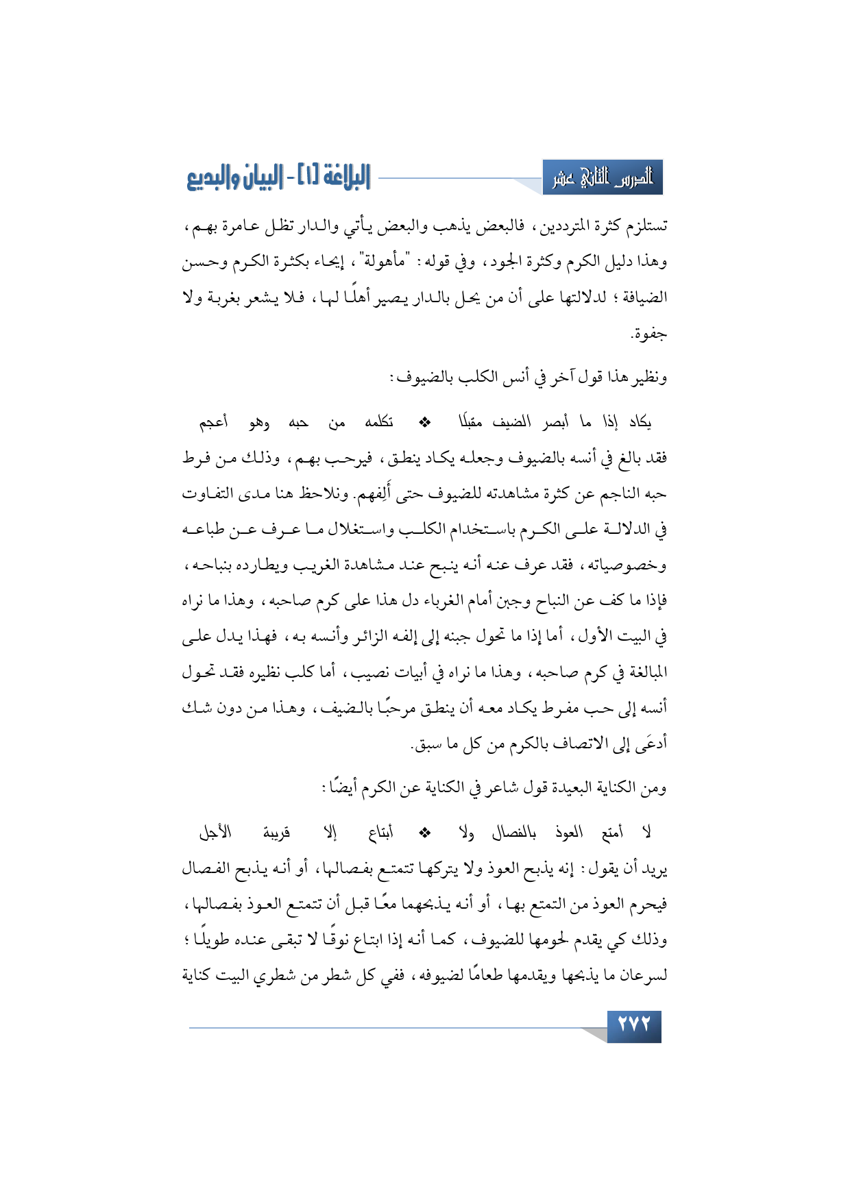 فقد بالغ في أنسه بالضيوف وجعله يكاد ينطق، فيرحب بهم، وذلك من فرط حبه الناجم عن كثرة مشاهدته للضيوف حتى أَلِفهم. ونلاحظ هنا مدى التفاوت في الدلالة على الكرم باستخدام الكلب واستغلال ما عرف عن طباعه وخصوصياته، فقد عرف عنه أنه ينبح عند مشاهدة الغريب ويطارده بنباحه، فإذا ما كف عن النباح وجبن أمام الغرباء دل هذا على كرم صاحبه، وهذا ما نراه في البيت الأول، أما إذا ما تحول جبنه إلى إلفه الزائر وأنسه به، فهذا يدل على المبالغة في كرم صاحبه، وهذا ما نراه في أبيات نصيب، أما كلب نظيره فقد تحول أنسه إلى حب مفرط يكاد معه أن ينطق مرحبًا بالضيف، وهذا من دون شك أدعَى إلى الاتصاف بالكرم من كل ما سبق.