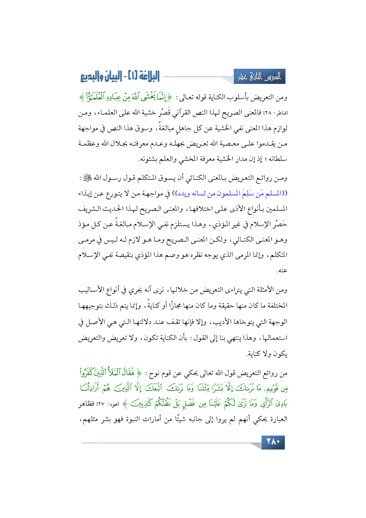 ومن التعريض بأسلوب الكناية قوله تعالى: {إِنَّمَا يَخْشَى اللَّهَ مِنْ عِبَادِهِ الْعُلَمَاءُ} (فاطر: 28) فالمعنى الصريح لهذا النص القرآني قَصْر خشية الله على العلماء، ومن لوازم هذا المعنى نفي الخشية عن كل جاهلٍ مبالغةً، وسوق هذا النص في مواجهة من يقدموا على معصية الله تعريض بجهله وعدم معرفته بجلال الله وعظمة سلطانه؛ إذ إن مدار الخشية معرفة المخشي والعلم بشئونه.