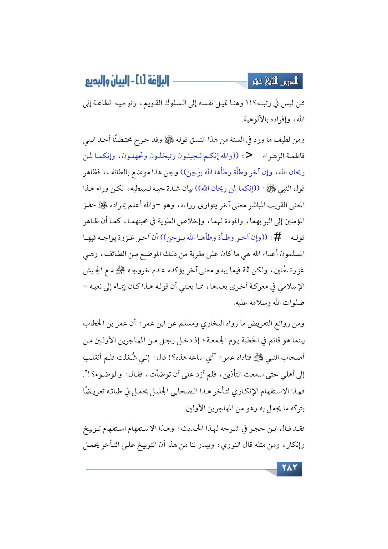 ومن لطيف ما ورد في السنة من هذا النسق قوله -صلى الله عليه وسلم- وقد خرج محتضنًا أحد ابني فاطمة الزهراء -رضي الله عنها-: ((والله إنكم لتجبنون وتبخلون وتجهلون، وإنكما لمن ريحان الله، وإن آخر وطأة وطأها الله بوَجِن)) وجن هذا موضع بالطائف، فظاهر قول النبي -صلى الله عليه وسلم-: ((إنكما لمن ريحان الله)) بيان شدة حبه لسِبطيه، لكن وراء هذا المعنى القريب المباشر معنى آخر يتوارى وراءه، وهو -والله أعلم بمراده صلى الله عليه وسلم- حفز المؤمنين إلى البر بهما، والمودة لهما، وإخلاص الطوية في محبتهما، كما أن ظاهر قوله -عليه السلام-: ((وإن آخر وطأة وطأها الله بوجن)) أن آخر غزوة يواجه فيها المسلمون أعداء الله هي ما كان على مقربة من ذلك الموضع من الطائف، وهي غزوة حُنين، ولكن ثمة فيما يبدو معنى آخر يؤكده عدم خروجه -صلى الله عليه وسلم- مع الجيش الإسلامي في معركة أخرى بعدها، مما يعني أن قوله هذا كان إيماء إلى نعيه -صلوات الله وسلامه عليه-.